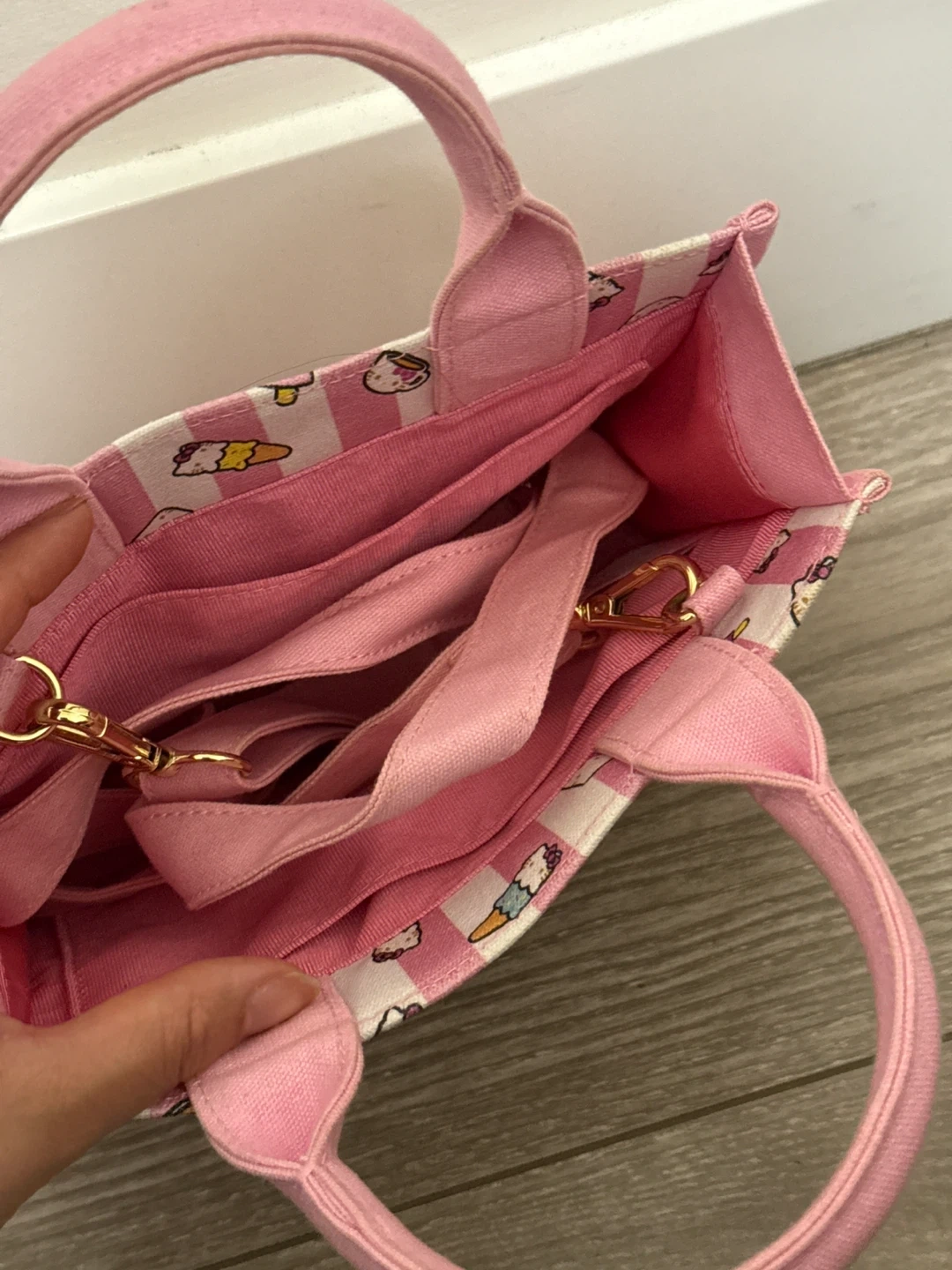 Cute pink mini tote bag featuring a fun Hello Kitty ice cream print. It has multiple internal pockets and a detachable shoulder strap. Perfect for small essentials!
