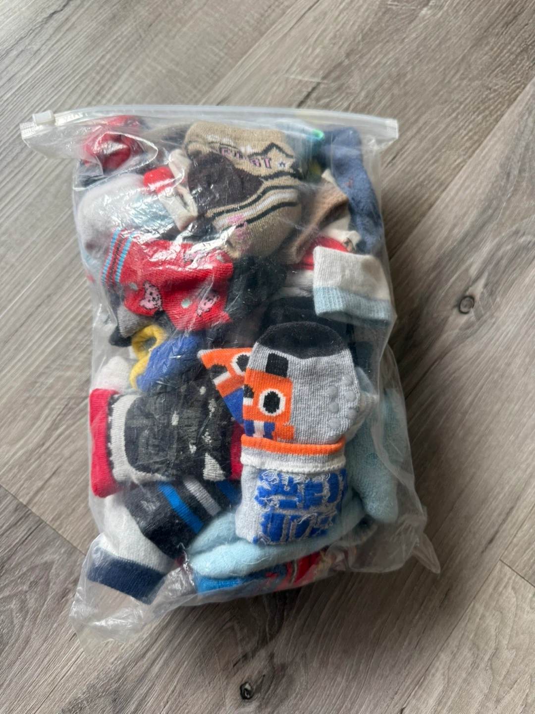 Bag filled with a variety of toddler socks, featuring different colours and patterns. Some socks have grippy soles. Perfect for keeping little feet warm and cozy!