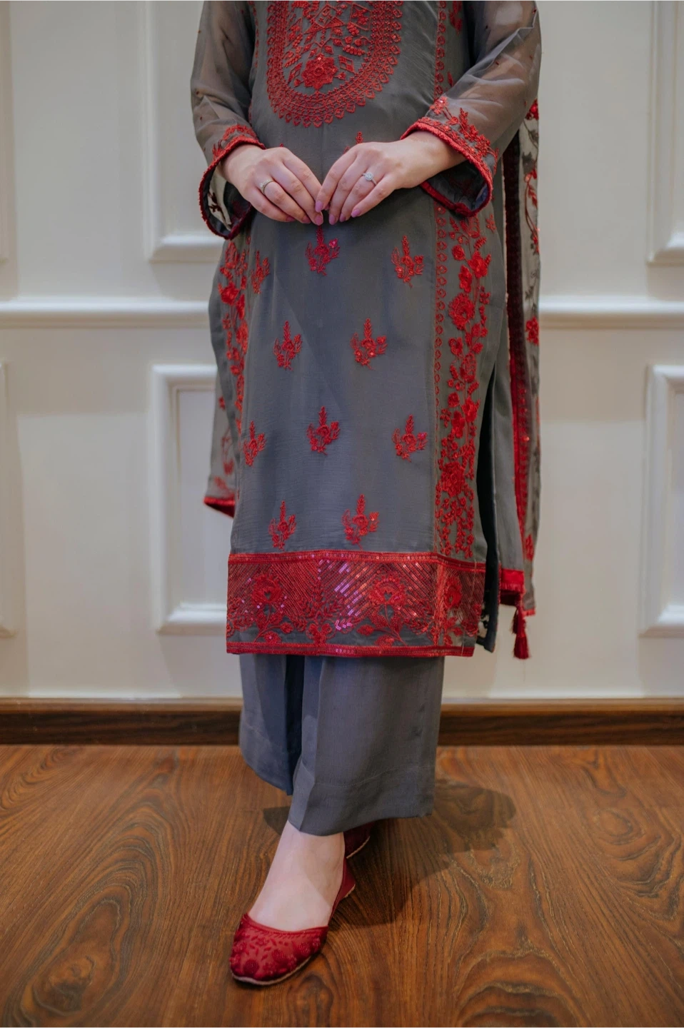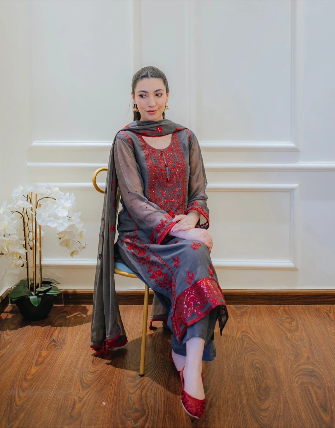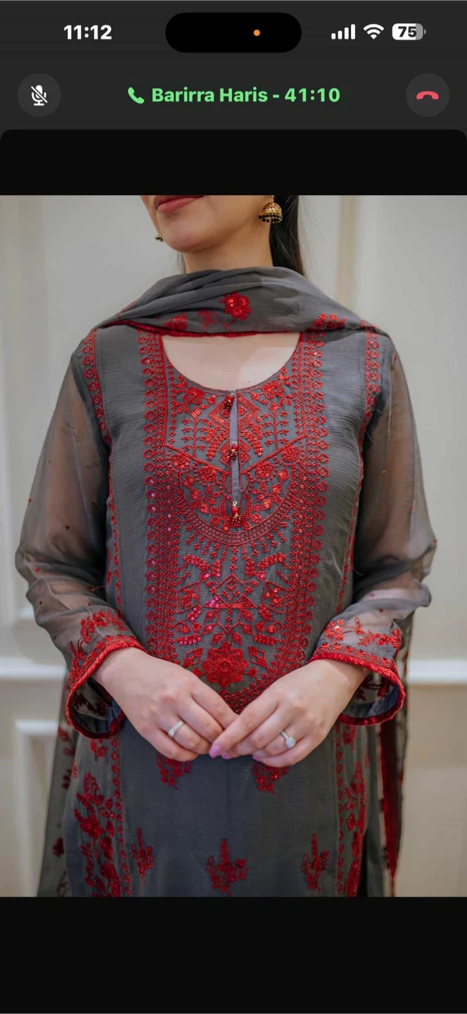 Beautiful 3-piece stitched suit in grey with red embroidery and sequin detailing. Includes a matching dupatta and trousers. Organza sleeves and dupatta. Perfect for special occasions!