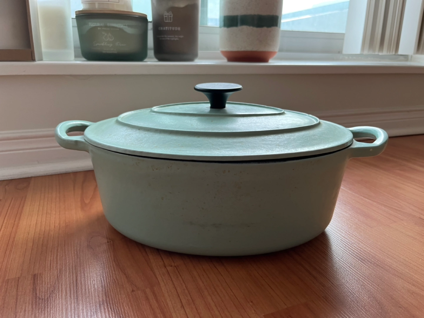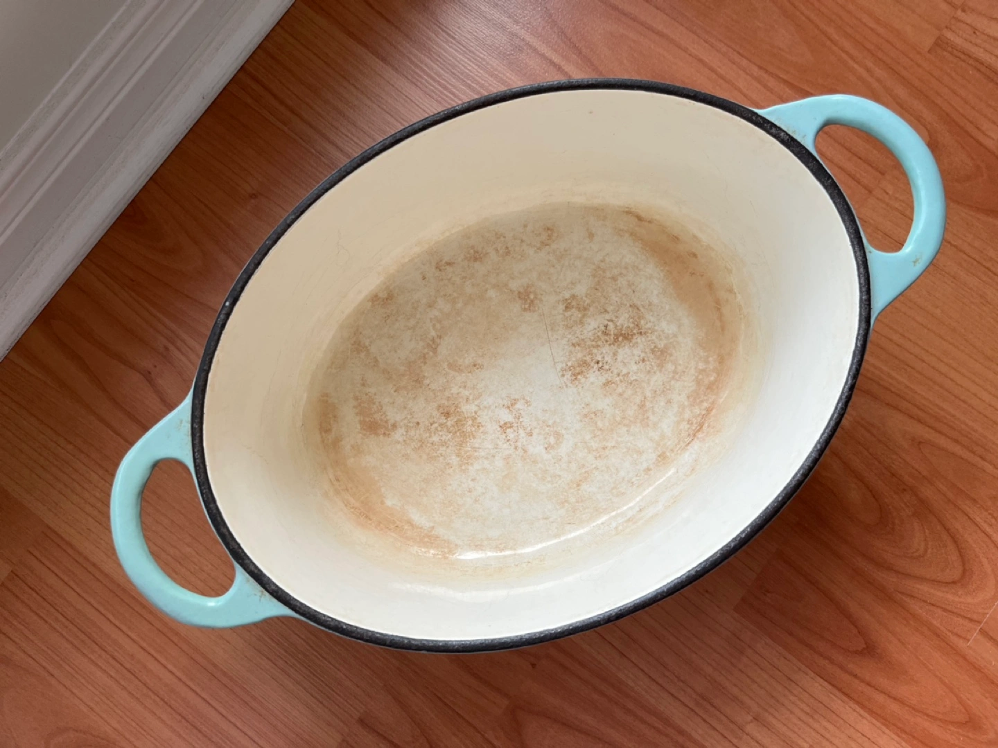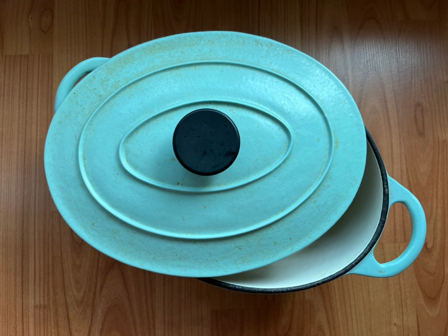 Dutch oven with Tiffany Blue exterior. Some minor staining which can be cleaned easily. Offering at discount with that in account :)