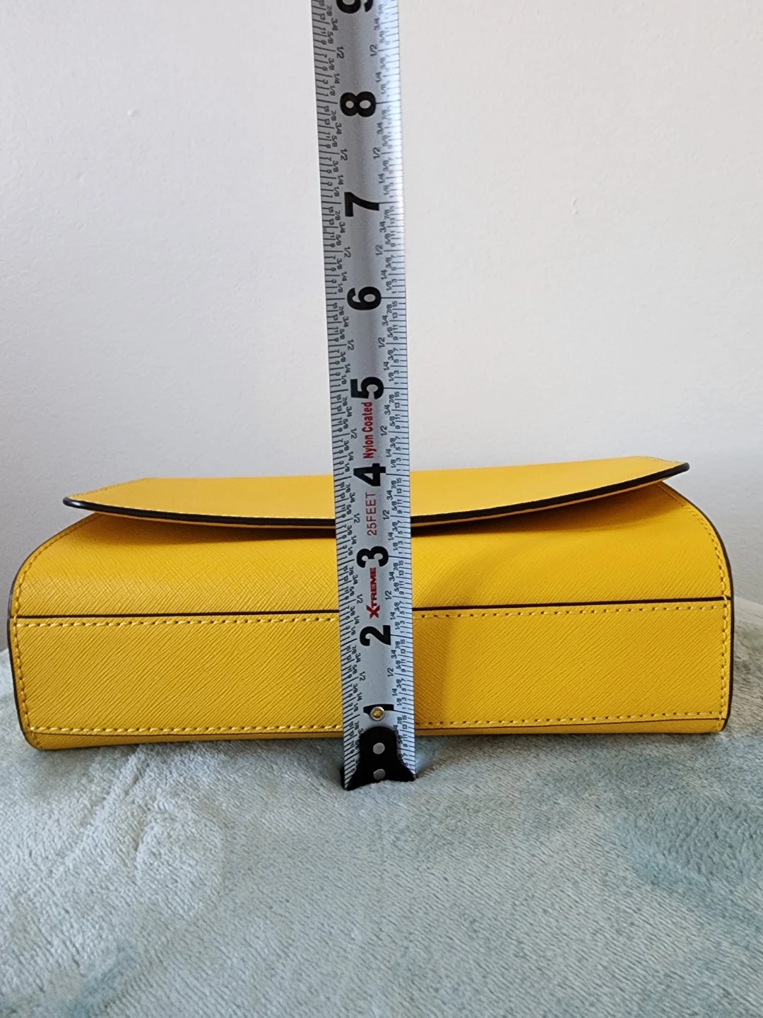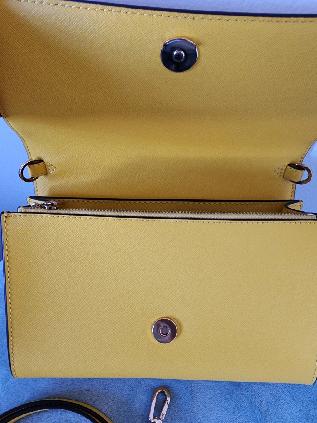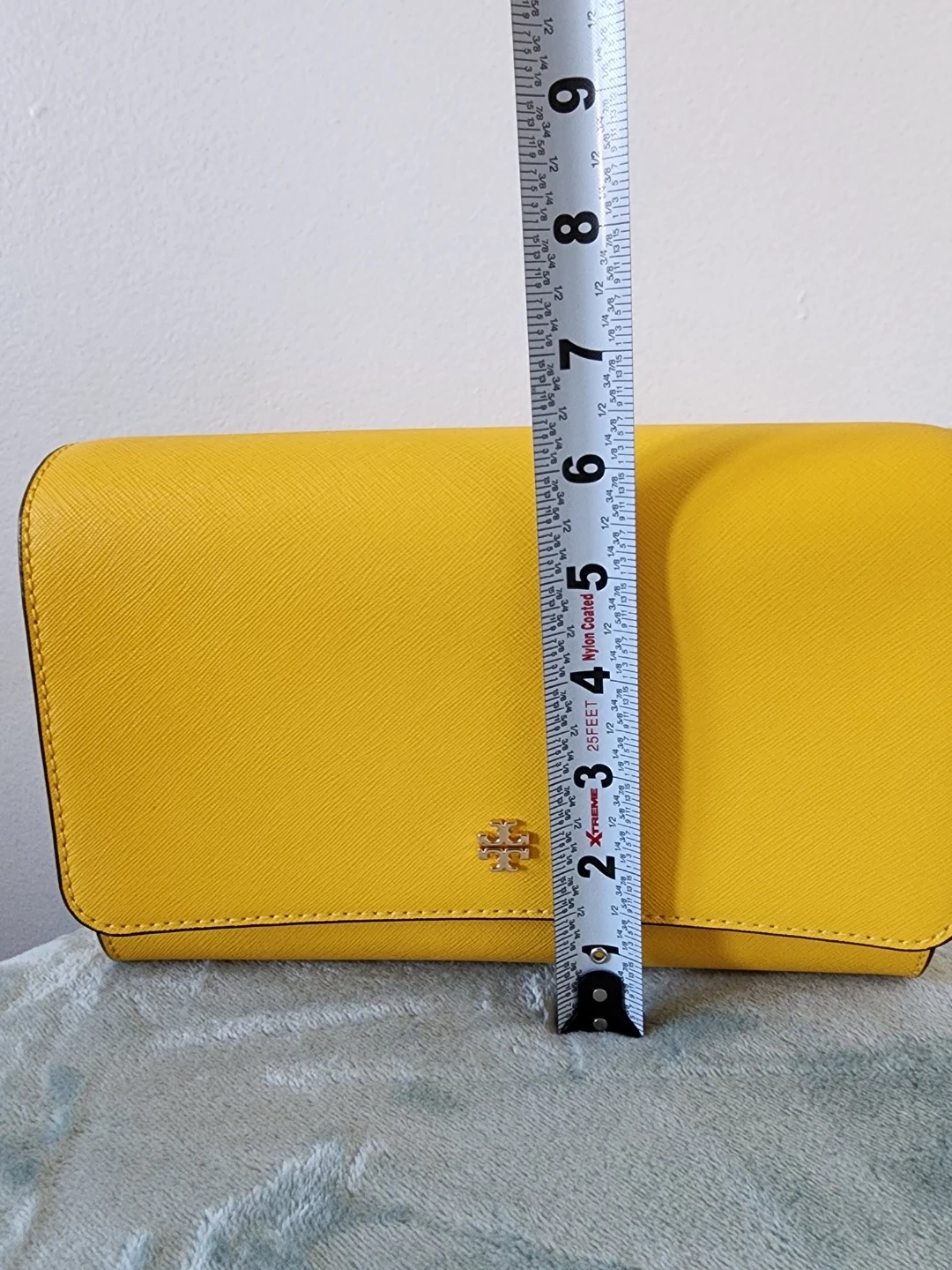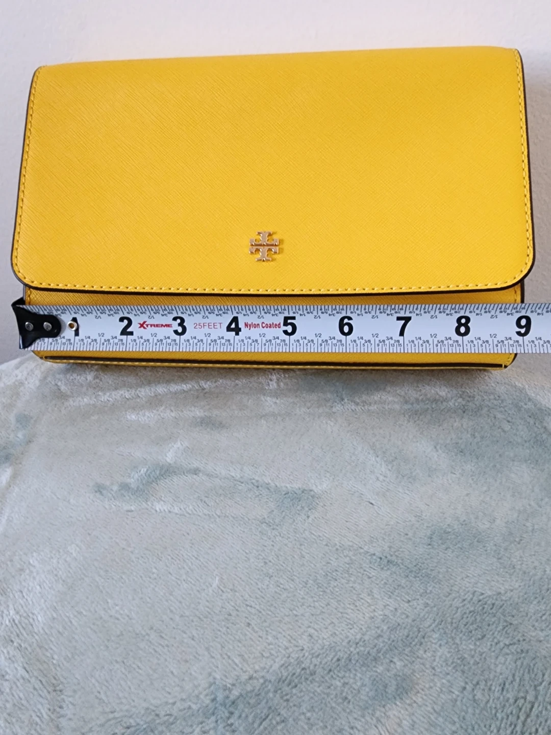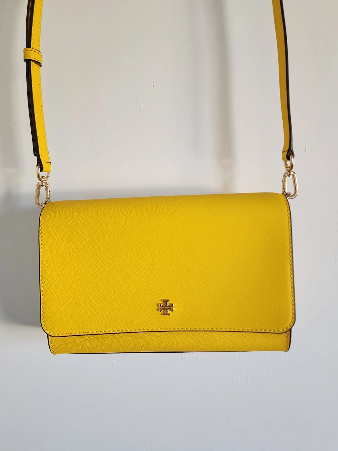 The Tory Burch Emerson chain wallet in lemon drop is a versatile accessory that will work well on the casual date as well as the formal work event; with denim, summer frocks, pencil skirts, and dress pants equally well. Saffiano Leather in a cross-hatch pattern, with gold hardware. Flap with magnetic closure. Removable chain with leather crossbody strap. 1 Slip Pocket on Back. Size : 19 x 3 x 12 cm. 1 Zip Pocket. 16 Card Slots. 2 Slip Pocket.