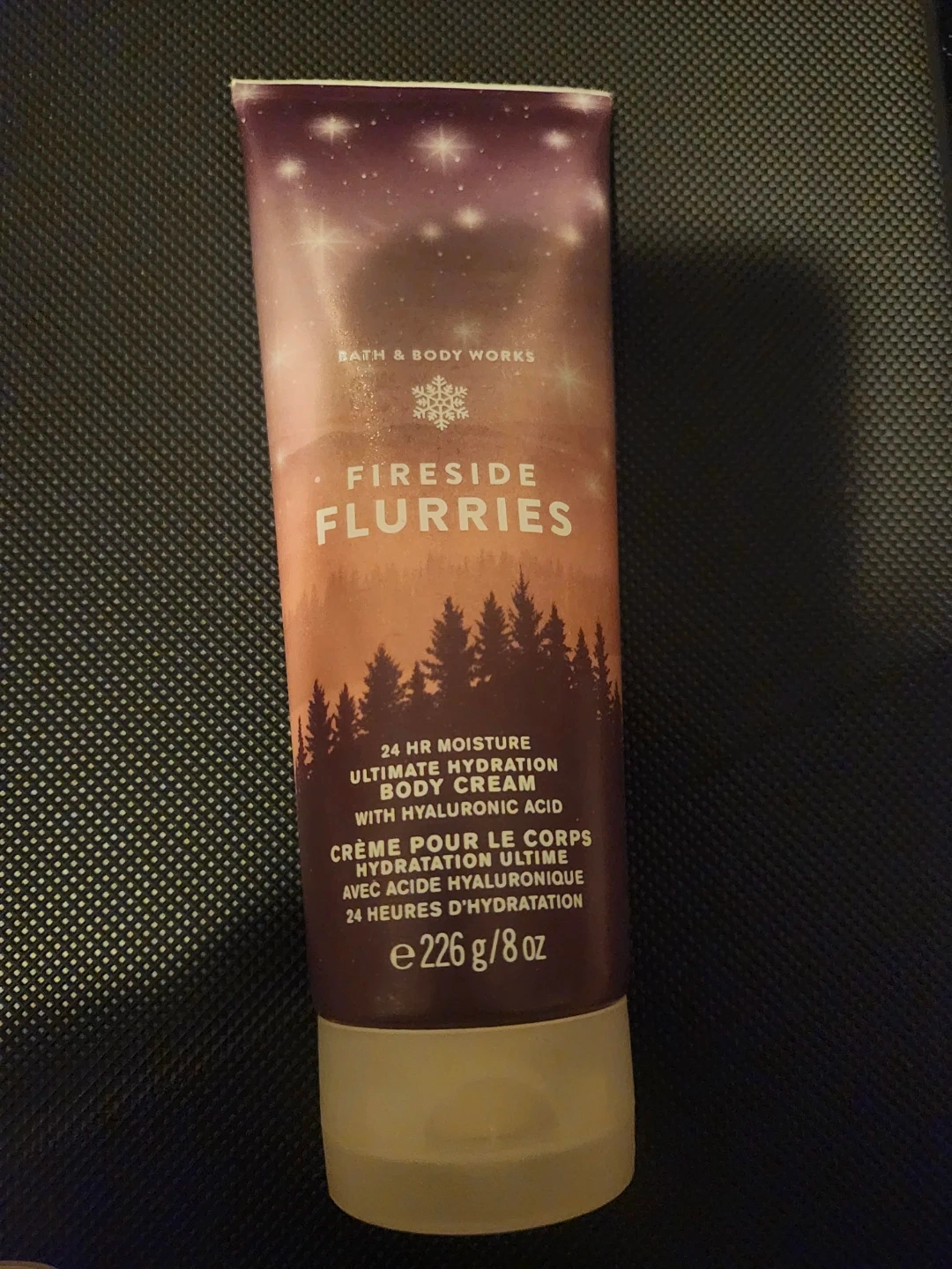 Bath & Body Works Fireside Flurries body cream provides 24-hour moisture. It's formulated with hyaluronic acid for ultimate hydration. Contains 8 oz of product.