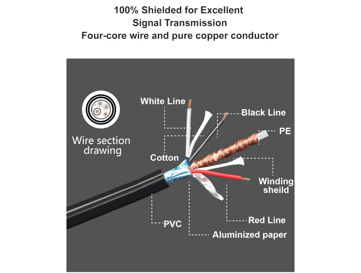 This 4-pin aviation extension cable features a waterproof design with a screw-fit connector and rubber O-ring for a secure connection. It's 100% shielded for excellent signal transmission and has a four-core wire with a pure copper conductor. Universally compatible with 4-pin aviation plugs, it's great for connecting backup camera systems on RVs, trucks, trailers, and buses.