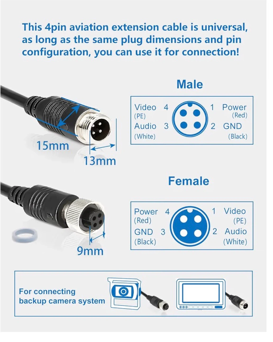 This 4-pin aviation extension cable features a waterproof design with a screw-fit connector and rubber O-ring for a secure connection. It's 100% shielded for excellent signal transmission and has a four-core wire with a pure copper conductor. Universally compatible with 4-pin aviation plugs, it's great for connecting backup camera systems on RVs, trucks, trailers, and buses.