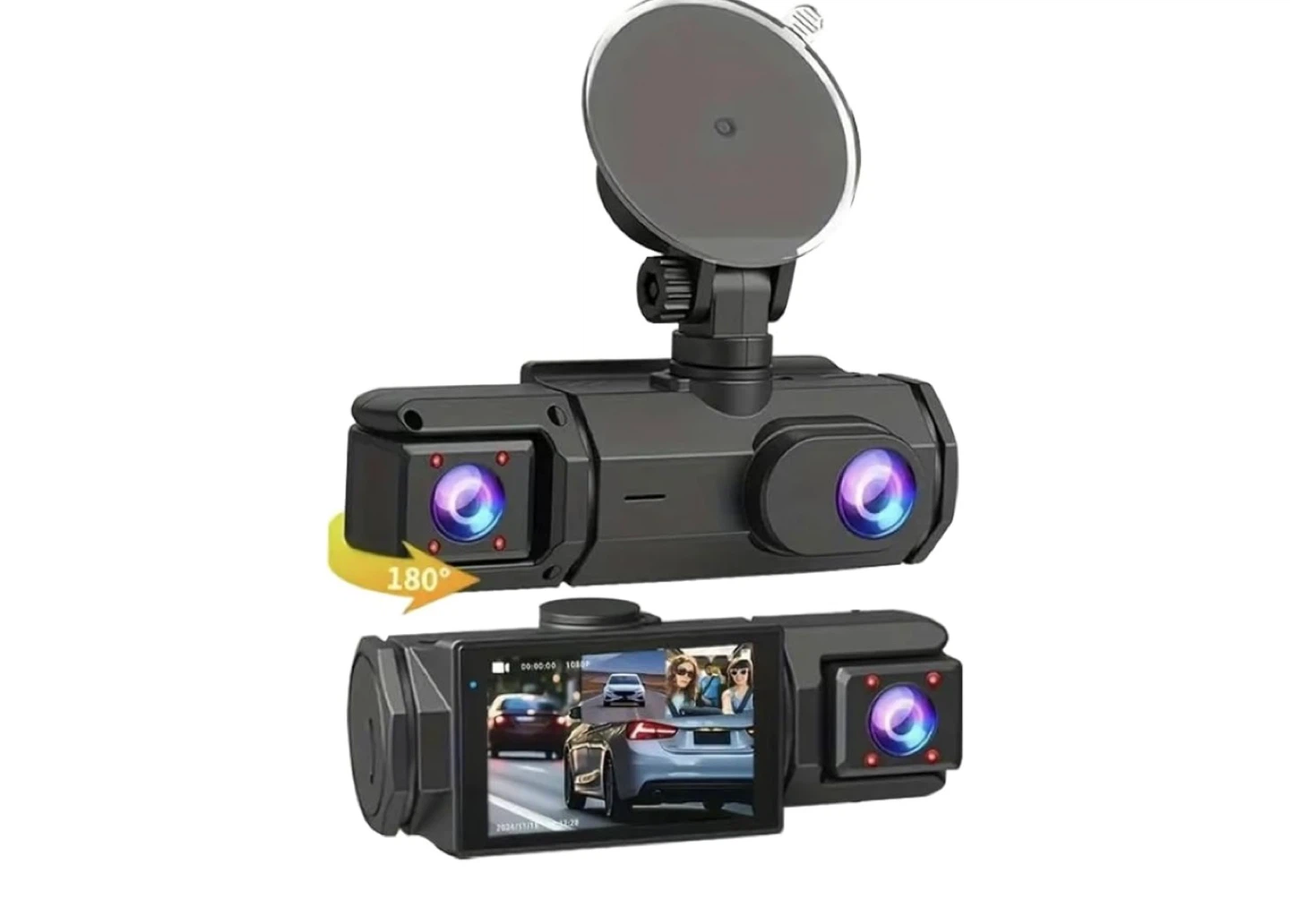 This dual-lens dash camera records your driving. It features a 180-degree adjustable front lens. Records in 1080p resolution.
