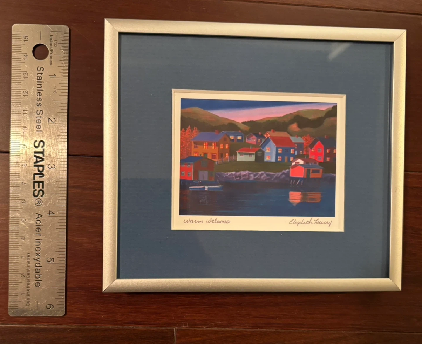 Selling a framed print by Canadian artist Elizabeth Burry, titled "Warm Welcome"! It's a lovely depiction of houses by the water, perfect for adding a touch of Newfoundland charm to your home. The frame is silver-toned and in great condition.