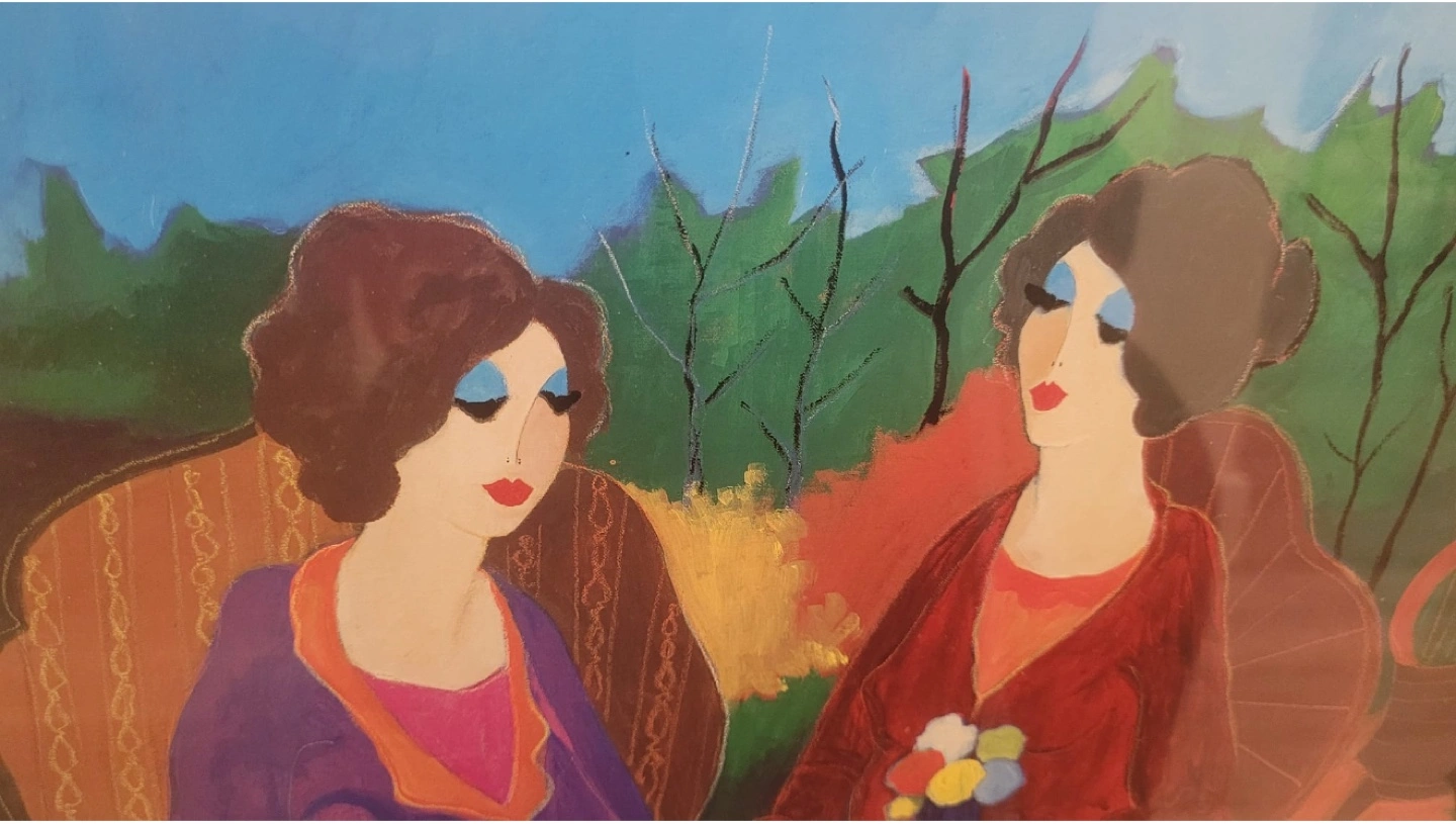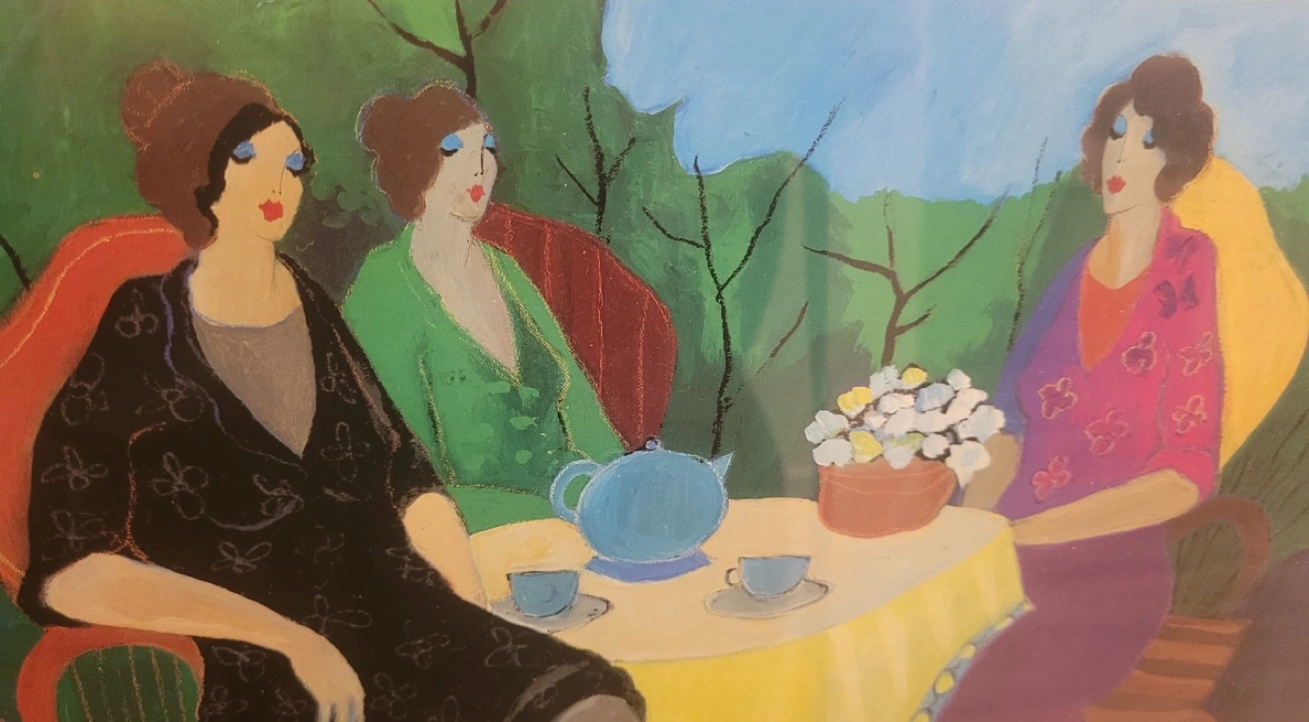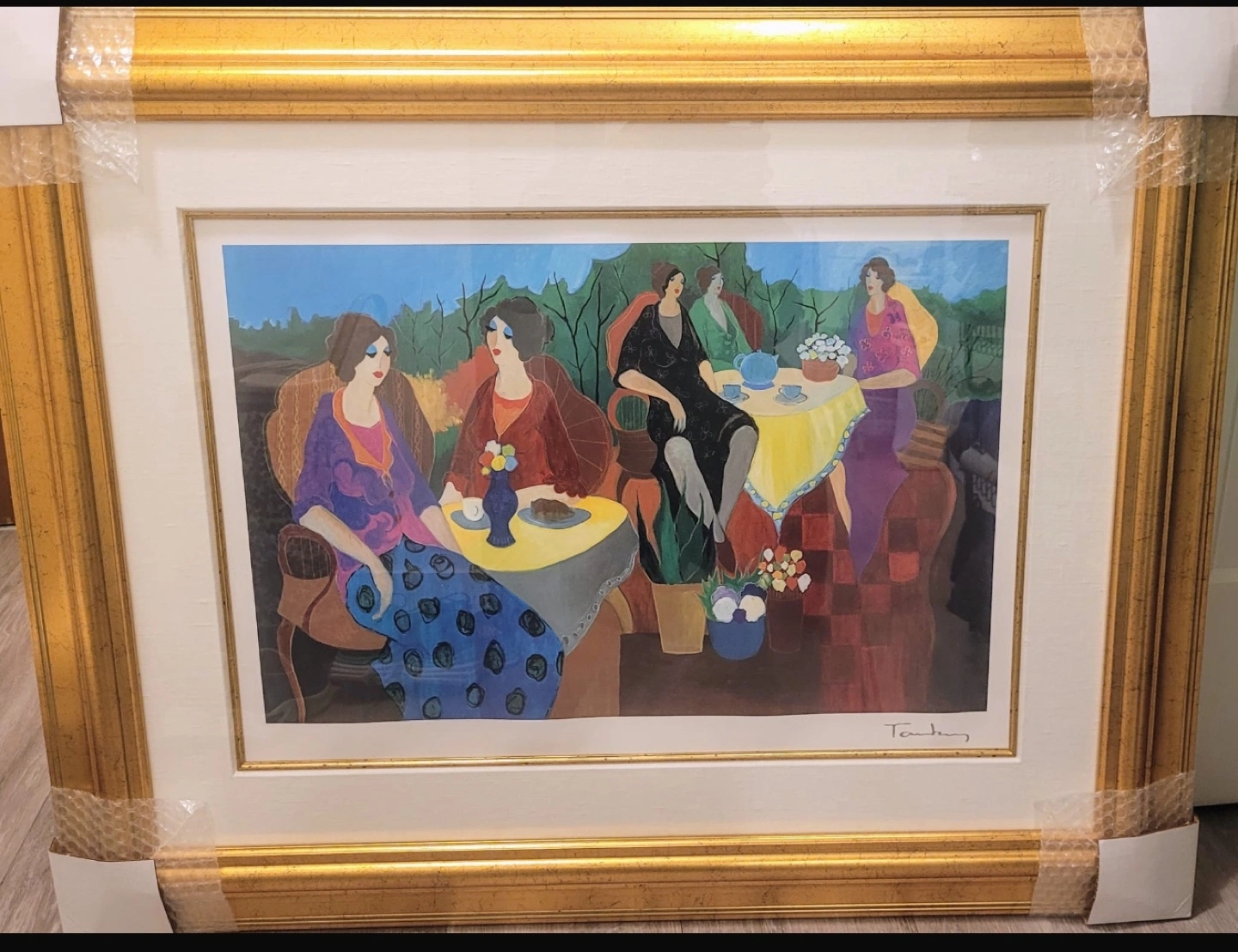 Beautiful framed print by the late Itzchak Tarkay. 24” X 16”. Depicts five ladies enjoying tea outdoors. Vibrant colors and bold lines. Gold coloured wood frame. Excellent condition. Have never been displayed.