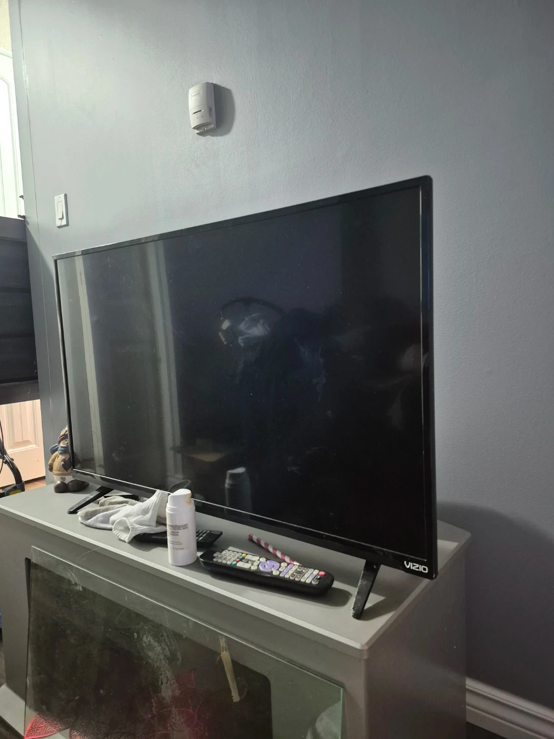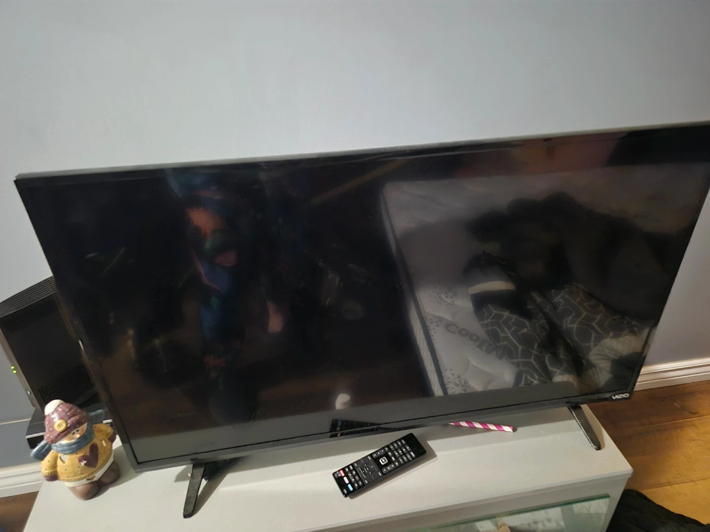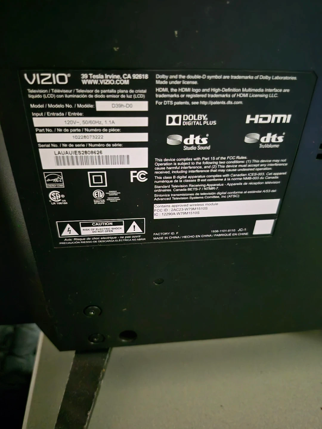 VIZIO D39h-D0 television. 120V~, 50/60Hz, 1.1A input. This is a functional television unit. It comes with a remote and power cord.