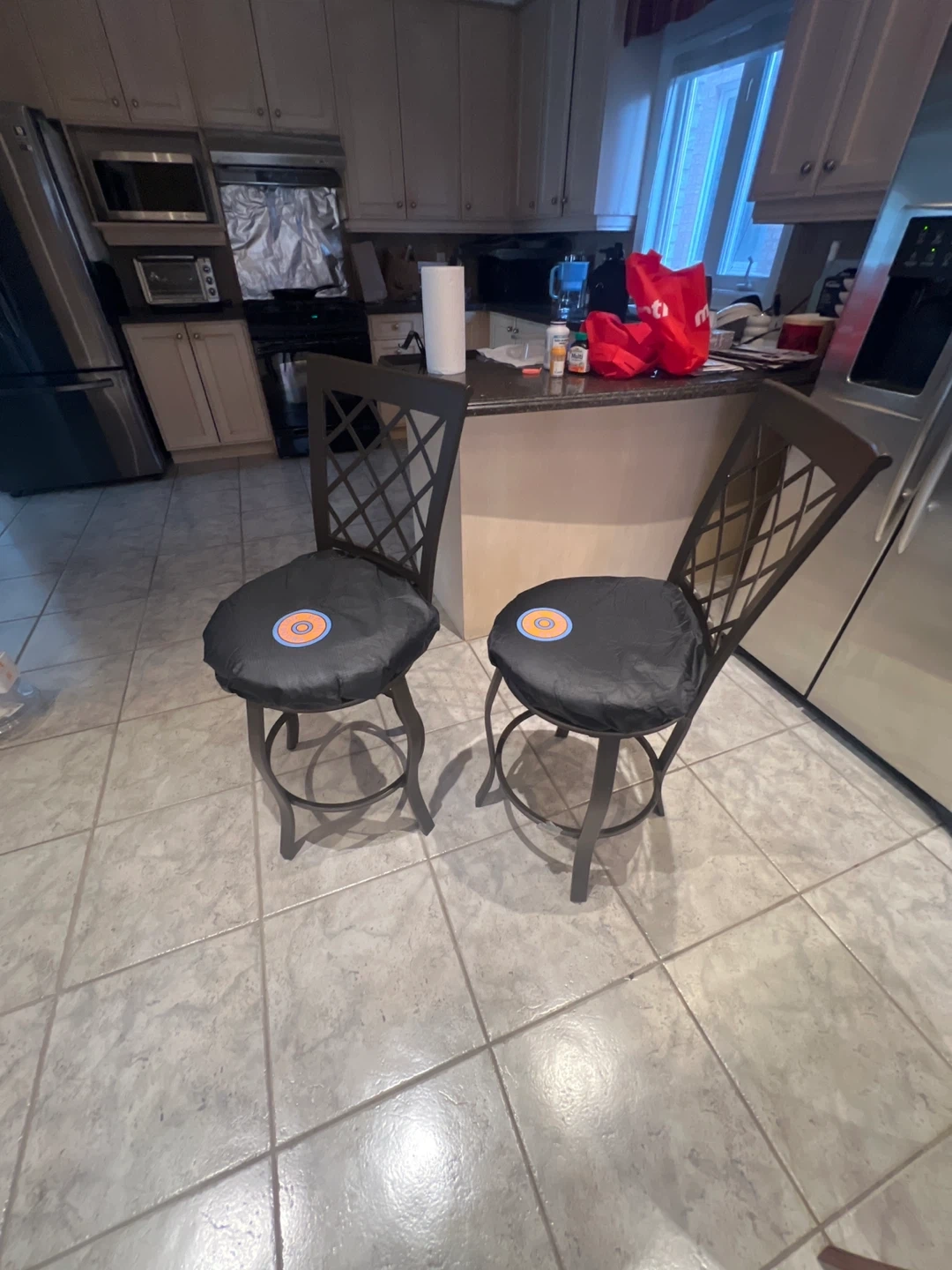 A set of two black bar stools with swivel seats. Each stool comes with a protective black cover featuring a circular emblem. These stools have metal frames and diamond-patterned backs. They're great for a kitchen island or home bar area!