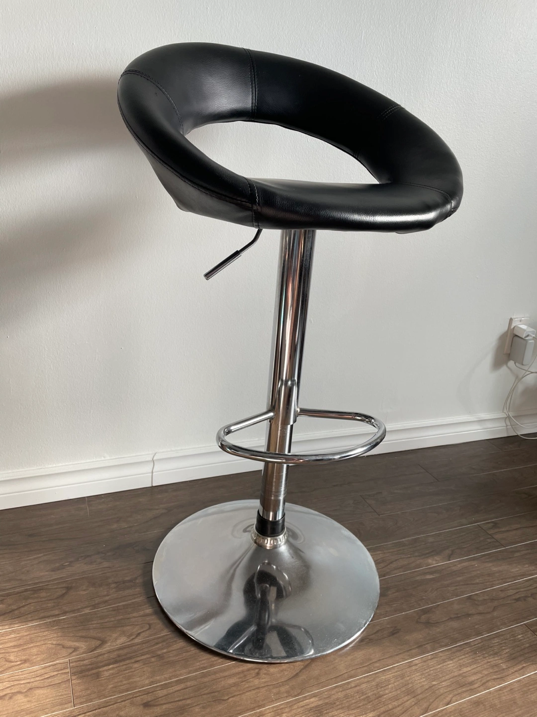 Here's a sleek black bar stool with a chrome base! It's adjustable, so you can set it to the perfect height for your counter or bar. The seat is comfy and stylish, perfect for adding a modern touch to your space