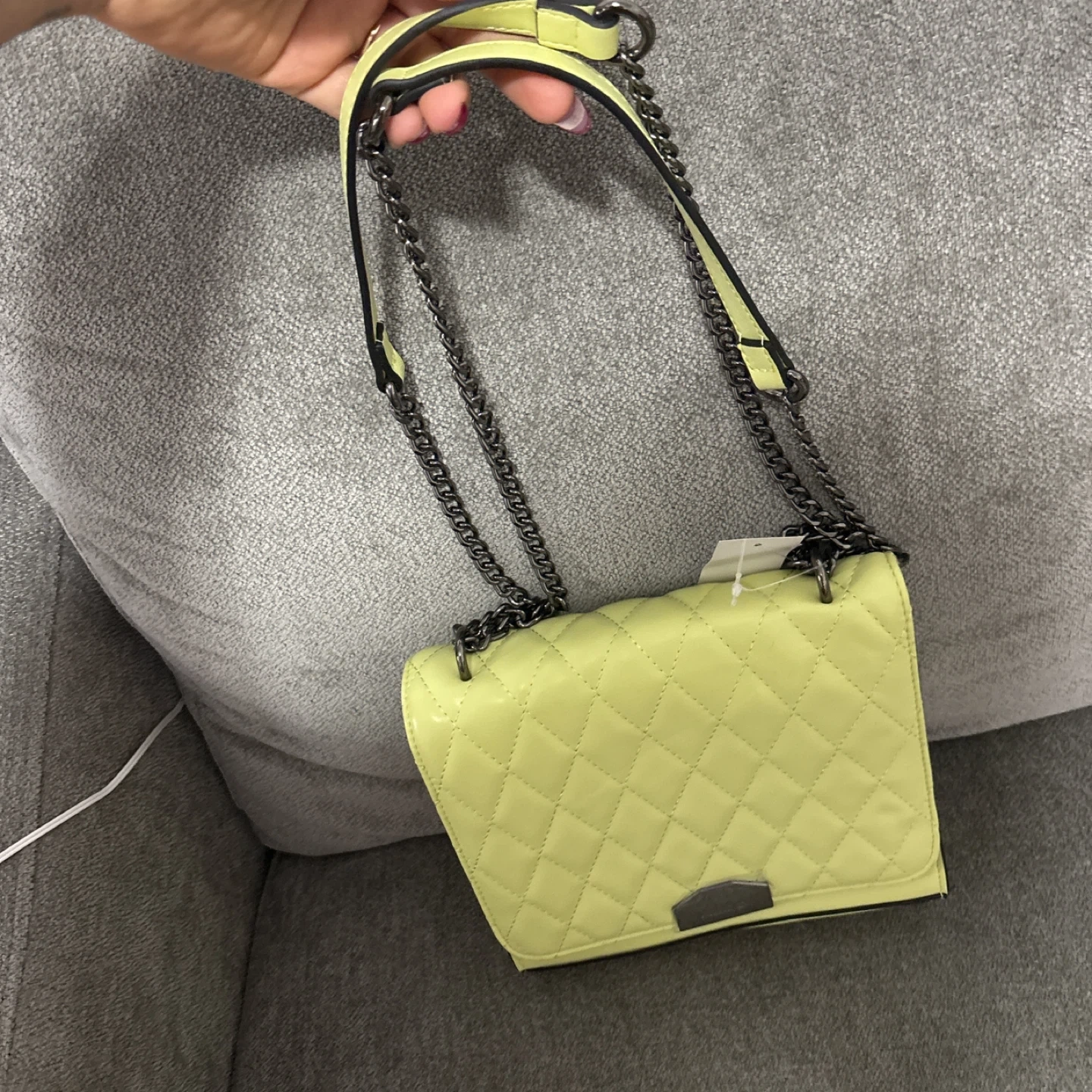 This ALDO crossbody bag features a stylish quilted design in a vibrant neon yellow. It comes with a dark metal chain strap for shoulder or crossbody wear. Bag material is patent faux leather.
