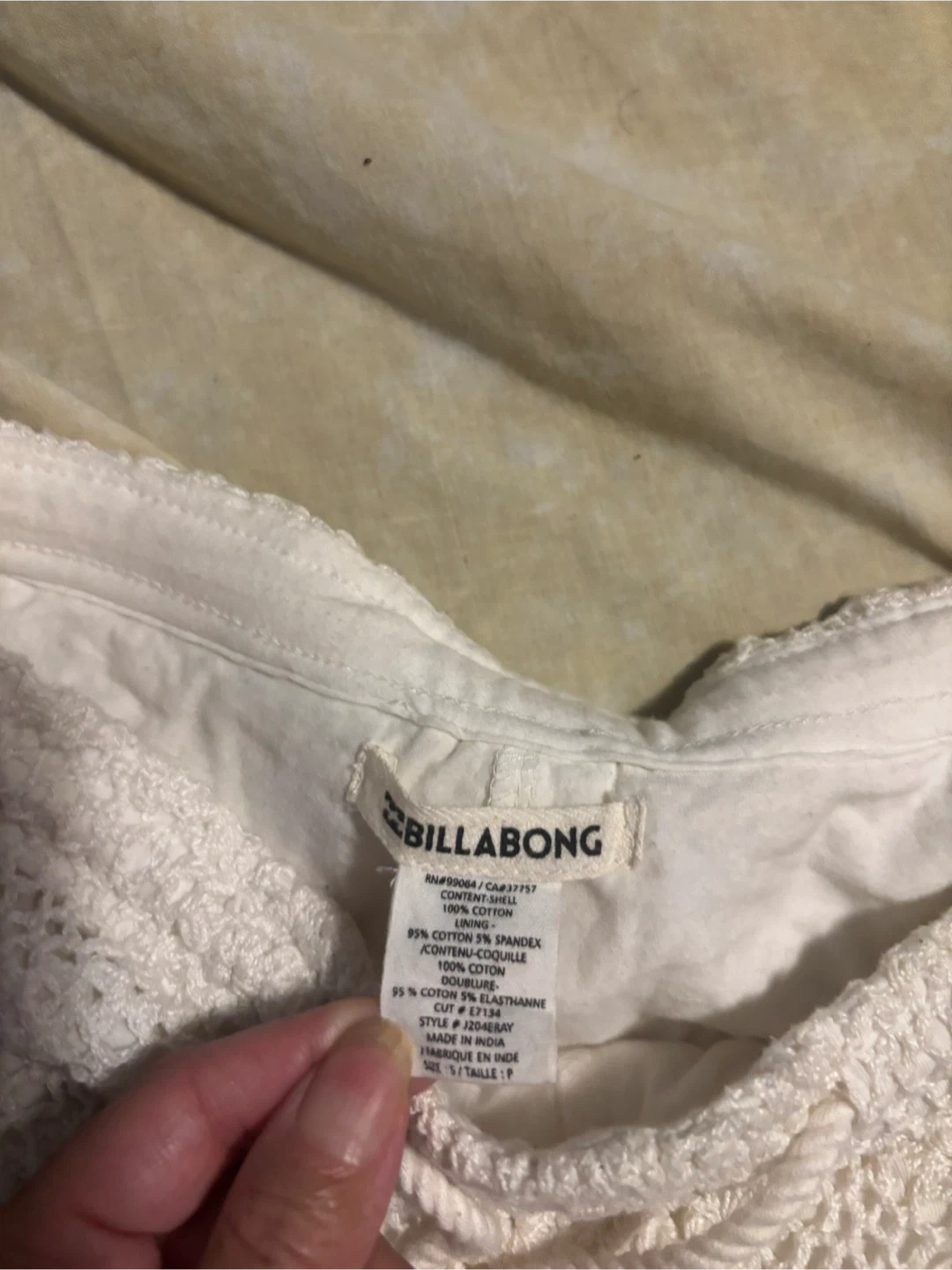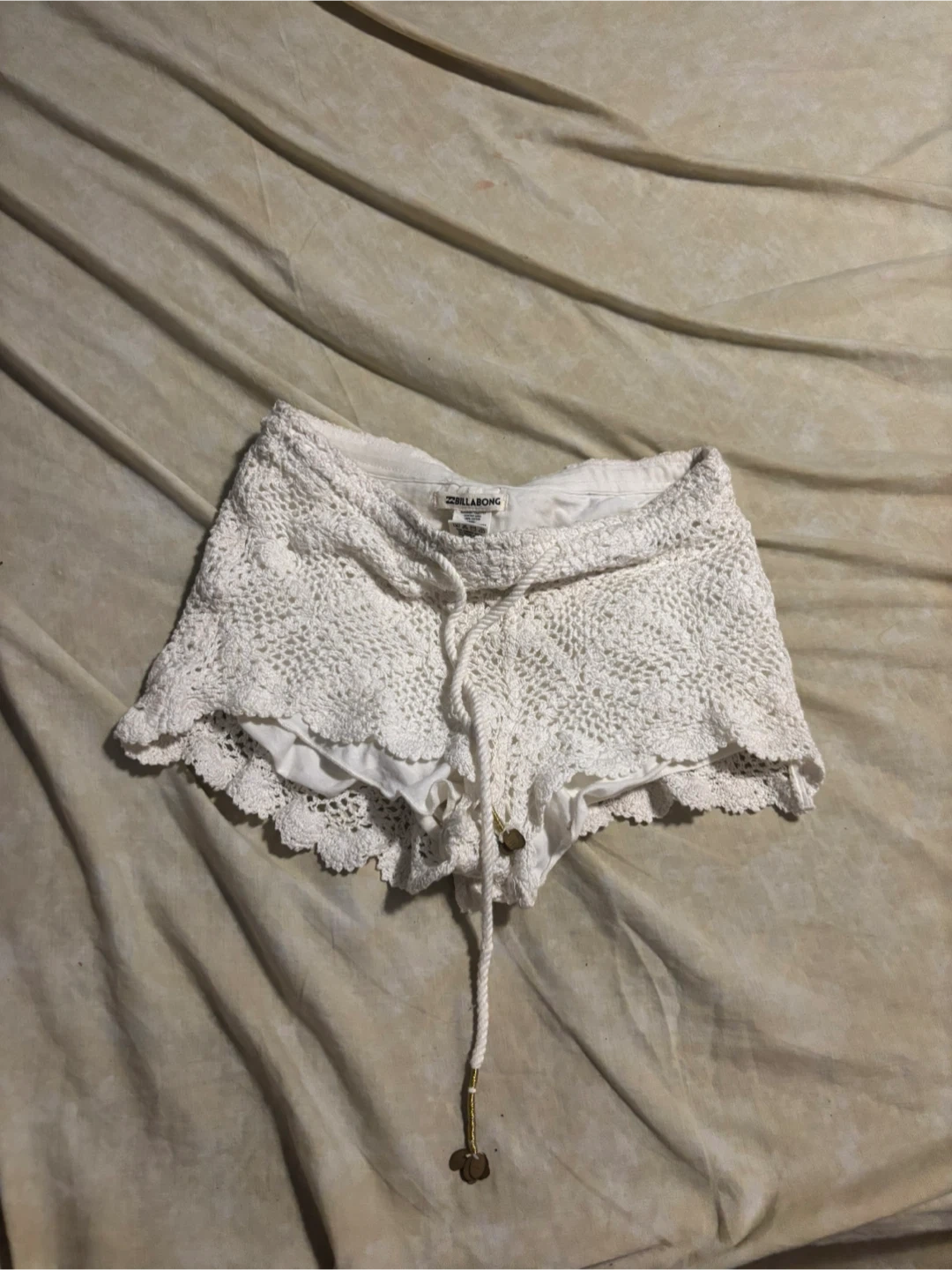 White crochet shorts from Billabong. Made with 95% cotton and 5% spandex. Size is small.