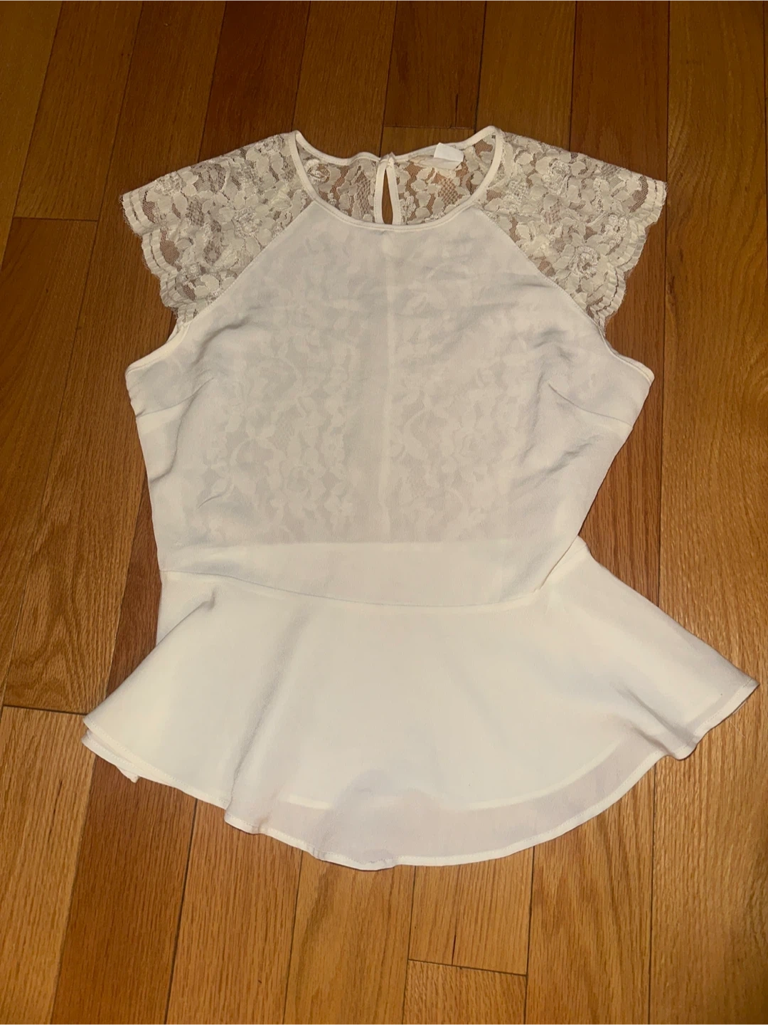 White peplum top with lace details on the shoulders and back. Short sleeves. Material is a blend, feels like polyester.