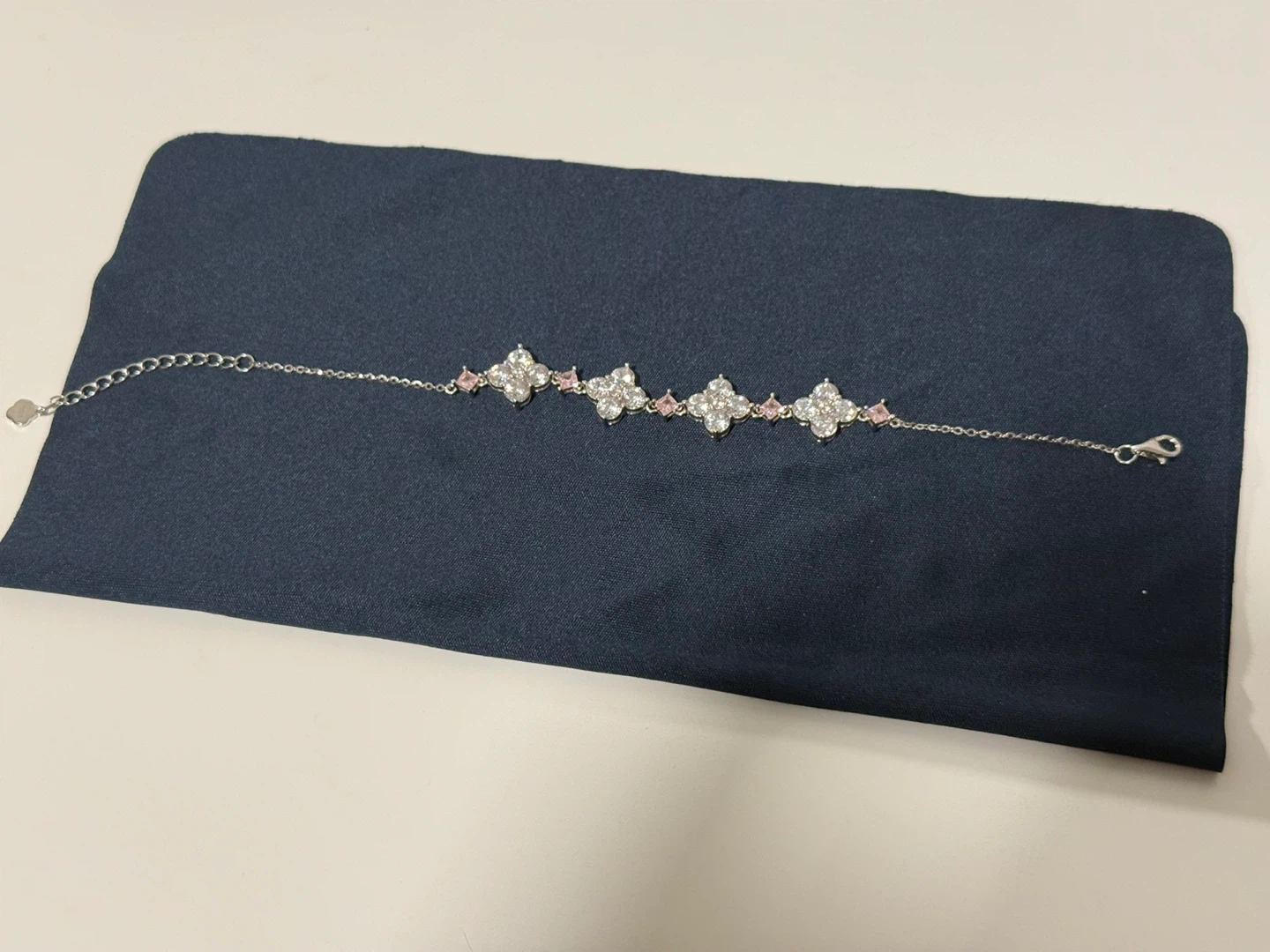 Beautiful silver-tone bracelet featuring four-leaf clover motifs. It's adorned with clear and small pink stones. The chain has an adjustable clasp for a comfortable fit.