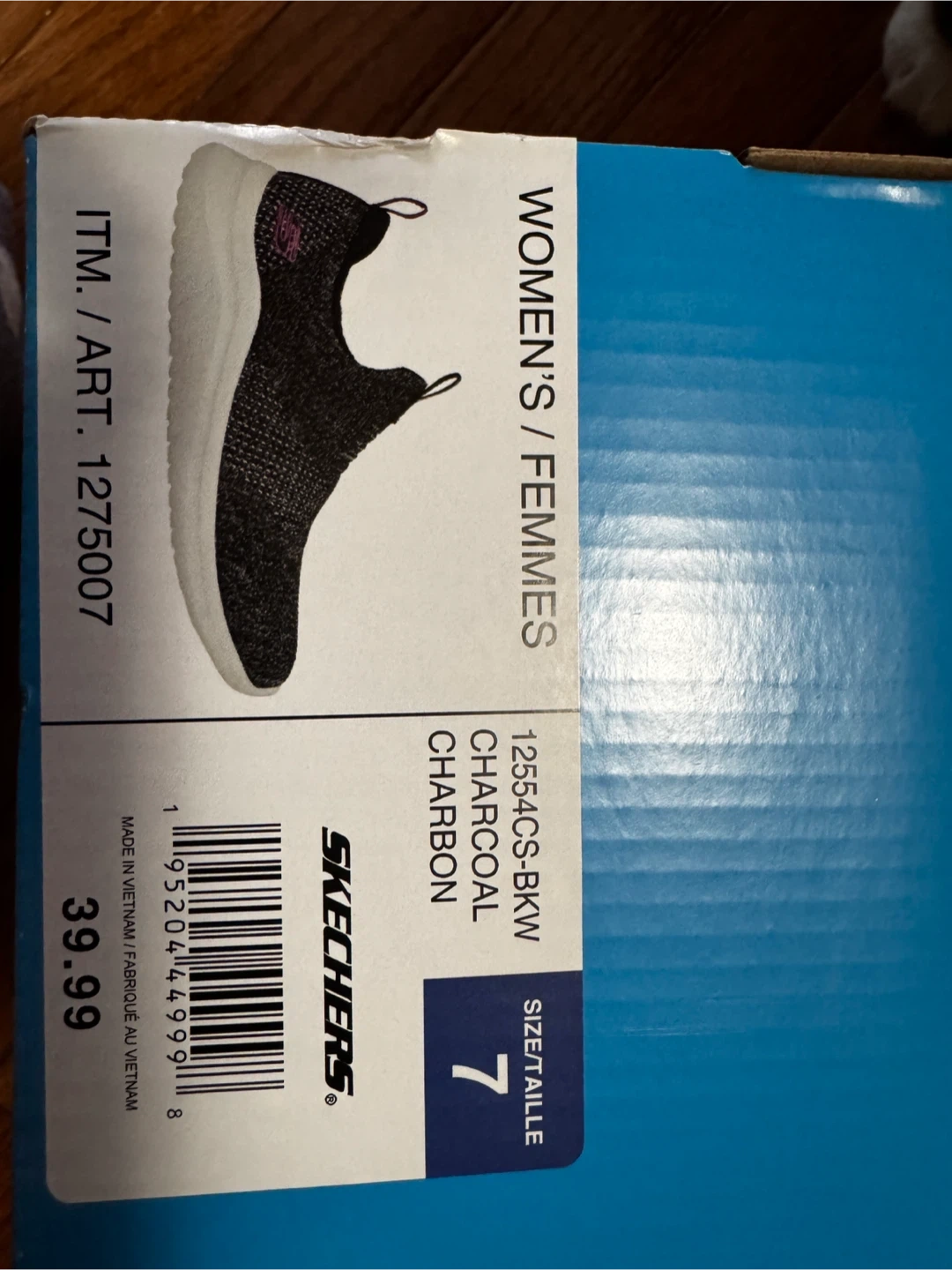 These are Skechers women's slip-on sneakers in charcoal. They are a size 7. The shoes are made with a breathable knit material and feature a cushioned insole. They're great for everyday wear or light exercise.