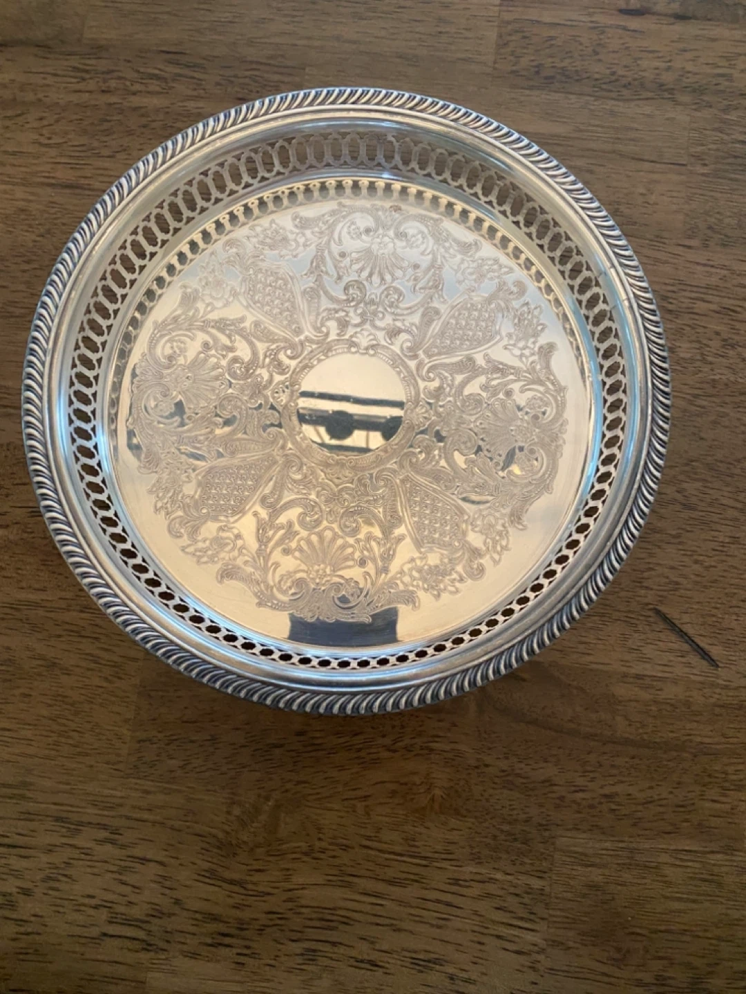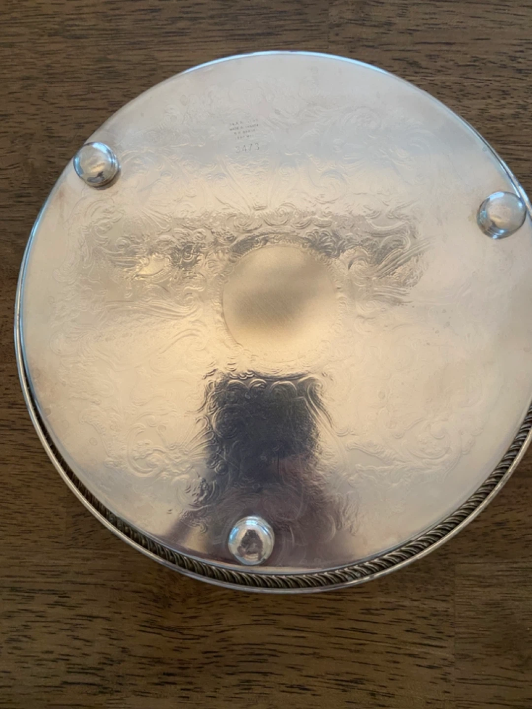 Selling a vintage silver plated serving tray. It has a beautiful, intricate design and a braided edge. Perfect for serving drinks or displaying items!