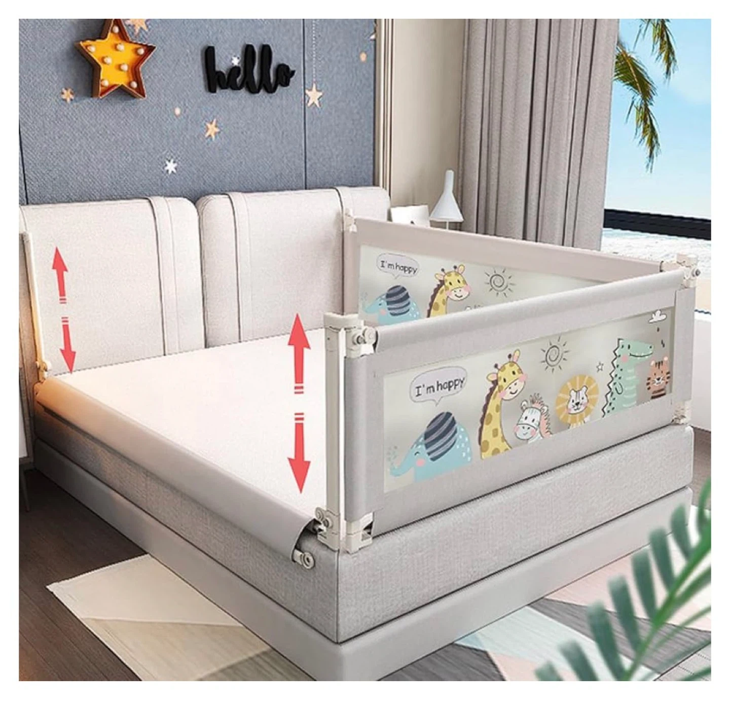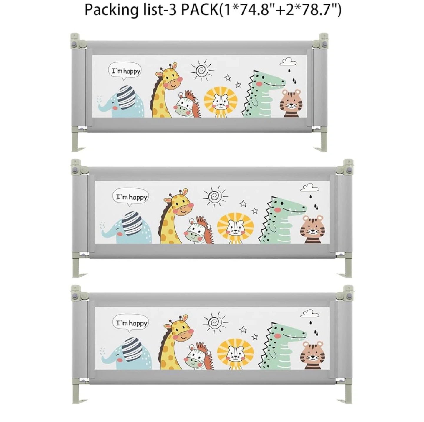 Set of three baby bed rails for toddler safety. Includes one rail measuring 74.8 inches and two measuring 78.7 inches. Designed to prevent little ones from falling out of bed.