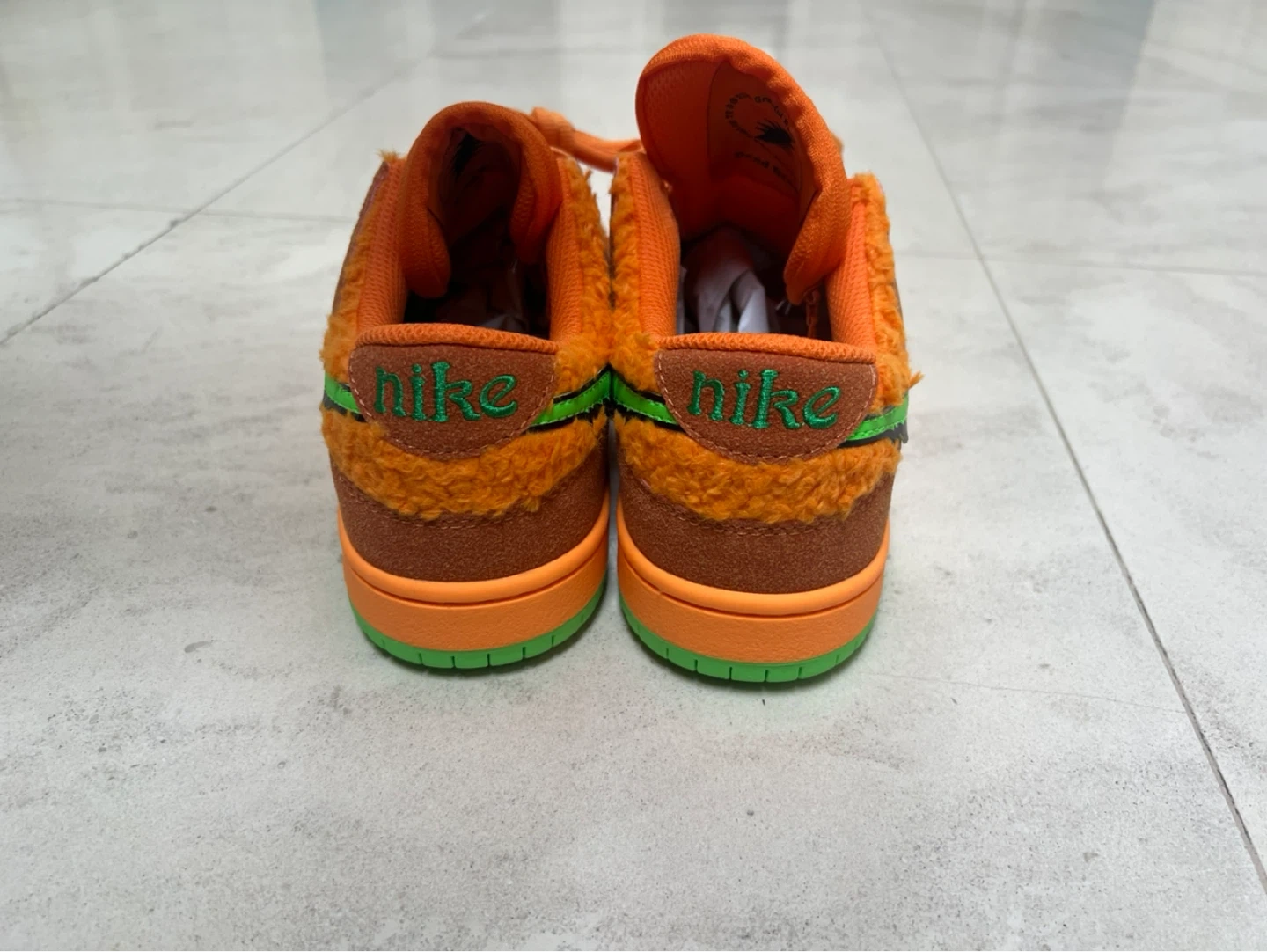 Nike SB Dunk Low 'Grateful Dead Bears' in orange. These have a fuzzy orange exterior with brown suede accents and a green sole. Includes original laces.
