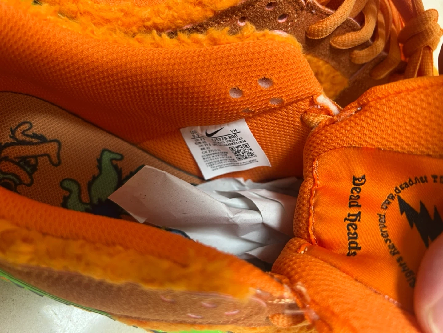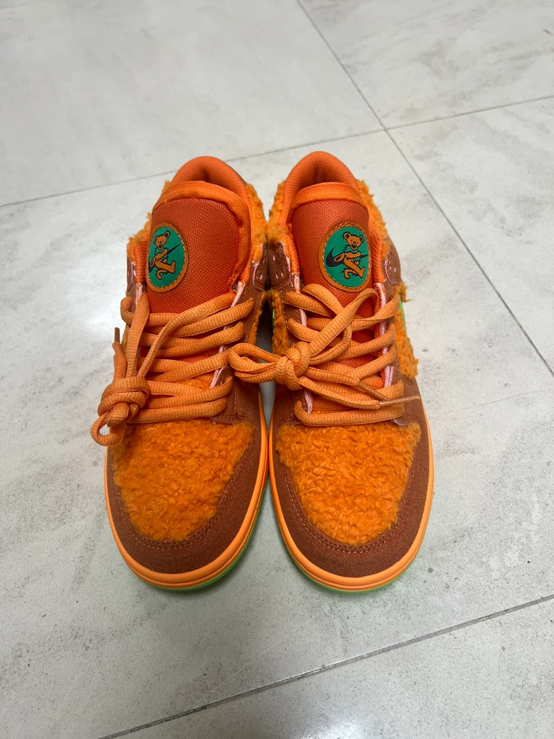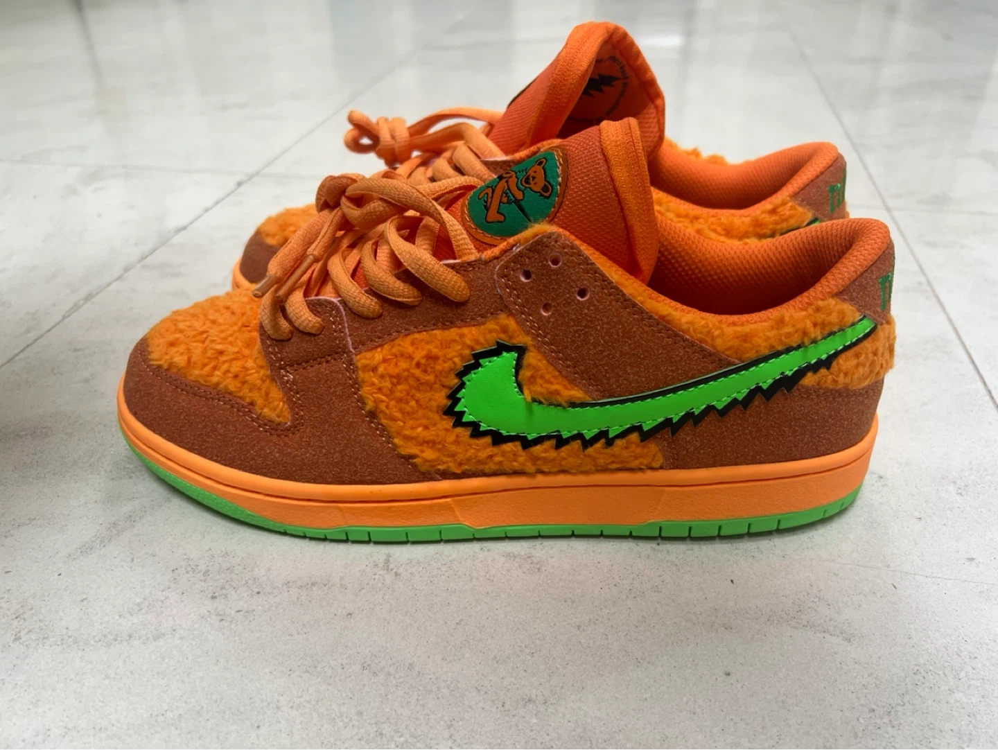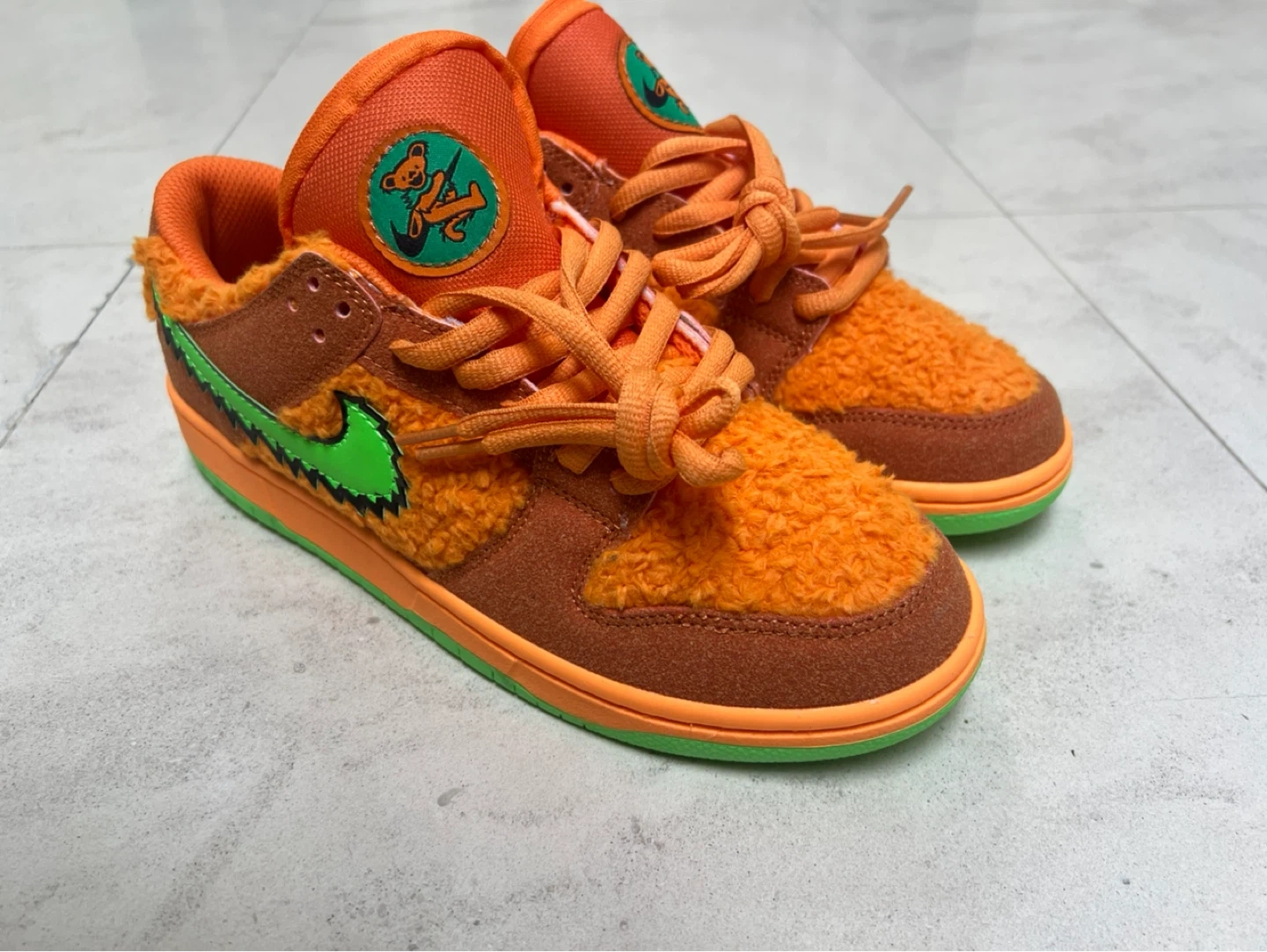 Nike SB Dunk Low 'Grateful Dead Bears' in orange. These have a fuzzy orange exterior with brown suede accents and a green sole. Includes original laces.