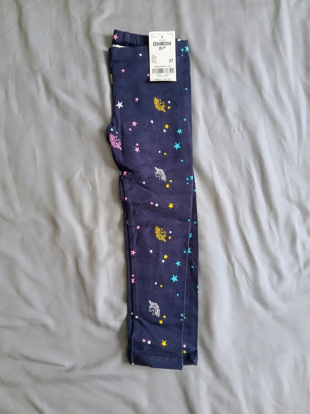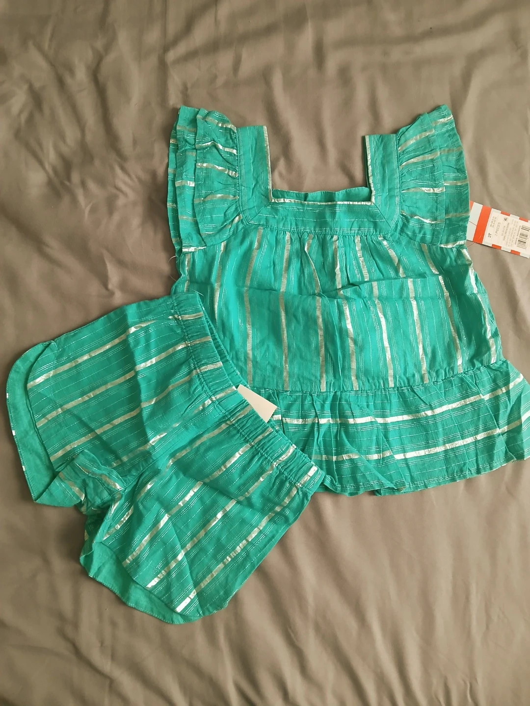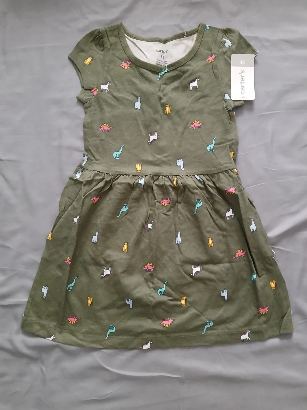 Includes teal striped shorts and top set, navy unicorn leggings, cream Jasmine t-shirt and shorts set, pink long-sleeve shirt and black leggings set, and olive green animal print dress. Size 3T.