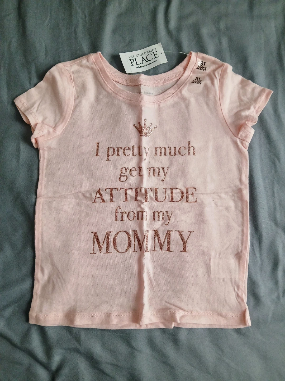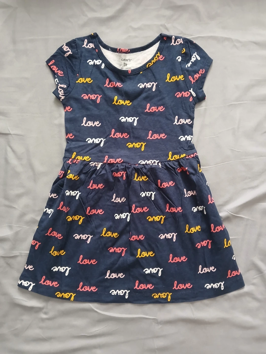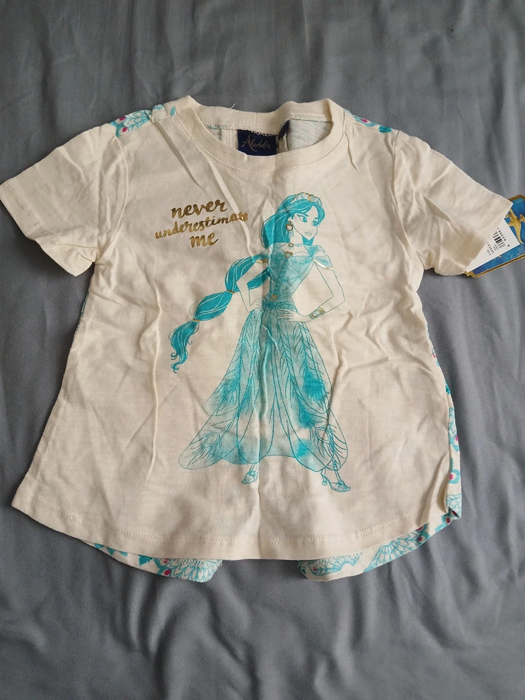 Includes teal striped shorts and top set, navy unicorn leggings, cream Jasmine t-shirt and shorts set, pink long-sleeve shirt and black leggings set, and olive green animal print dress. Size 3T.