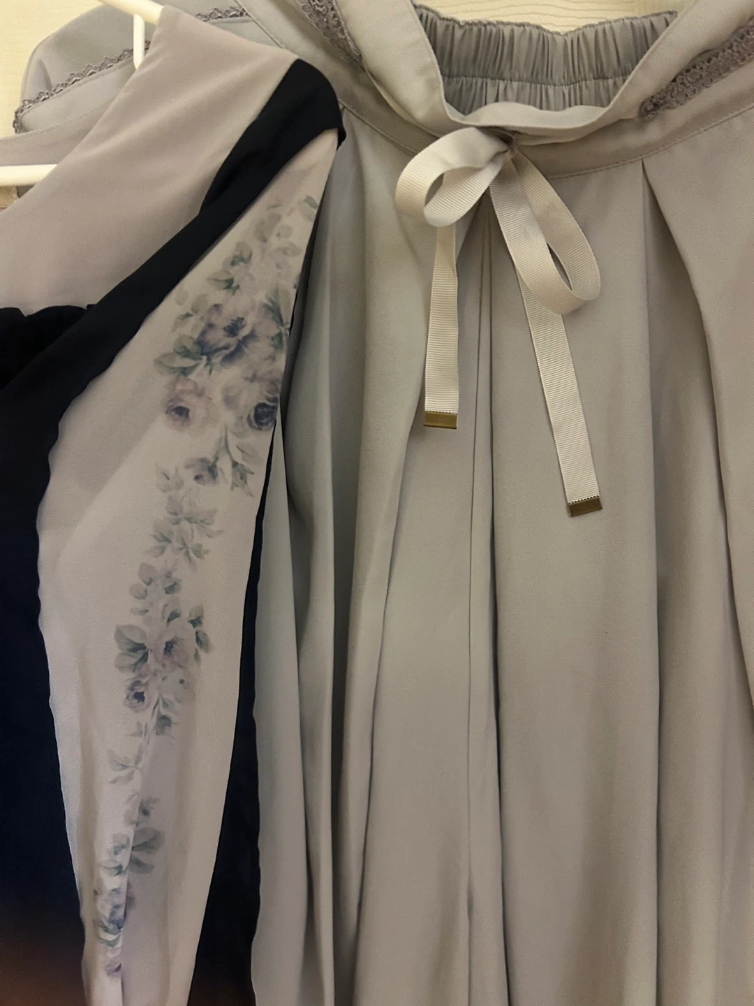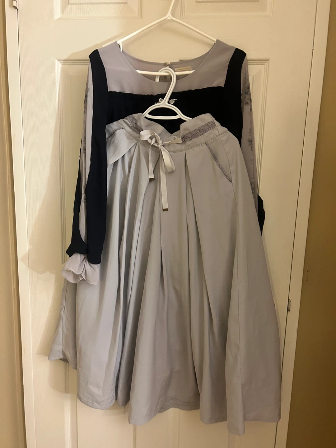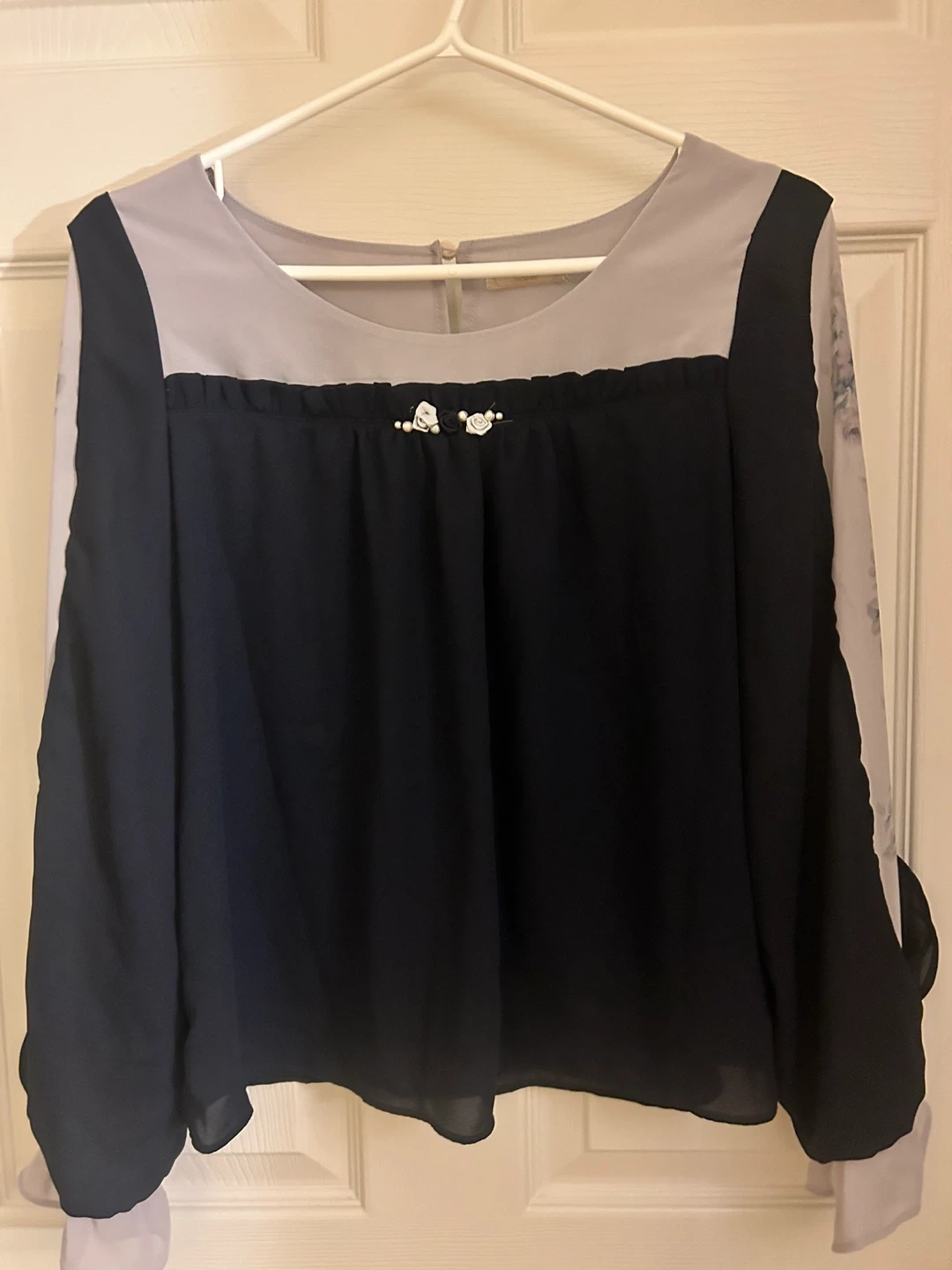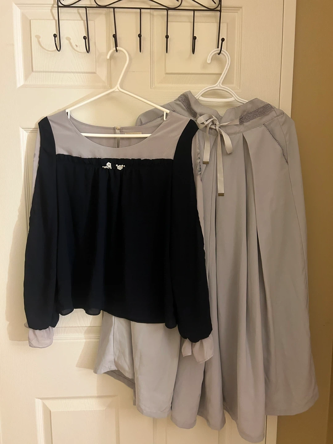 Selling an axes femme blouse and skirt set in grey and black. The blouse has a grey top and black bottom, with floral accents on the sleeves. The skirt is grey with a ribbon tie at the waist. It's a cute and stylish set! I only wore them once, in great conditions like new clothes.