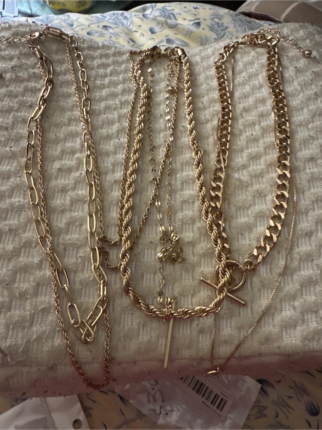 Set of layered gold-tone necklaces. Features various chain styles including a chunky cuban link and delicate strands with pendants. T-bar closure on one necklace.