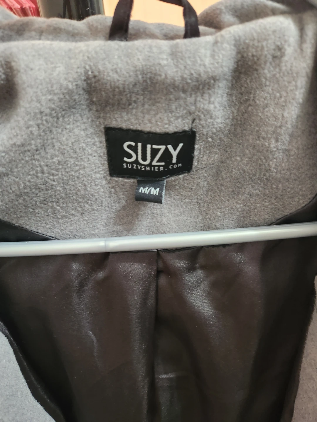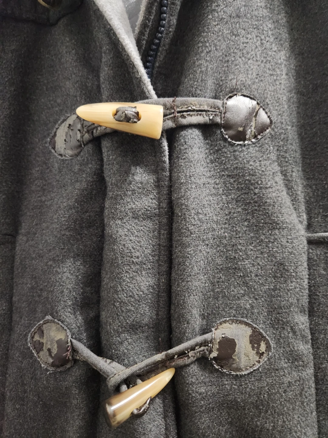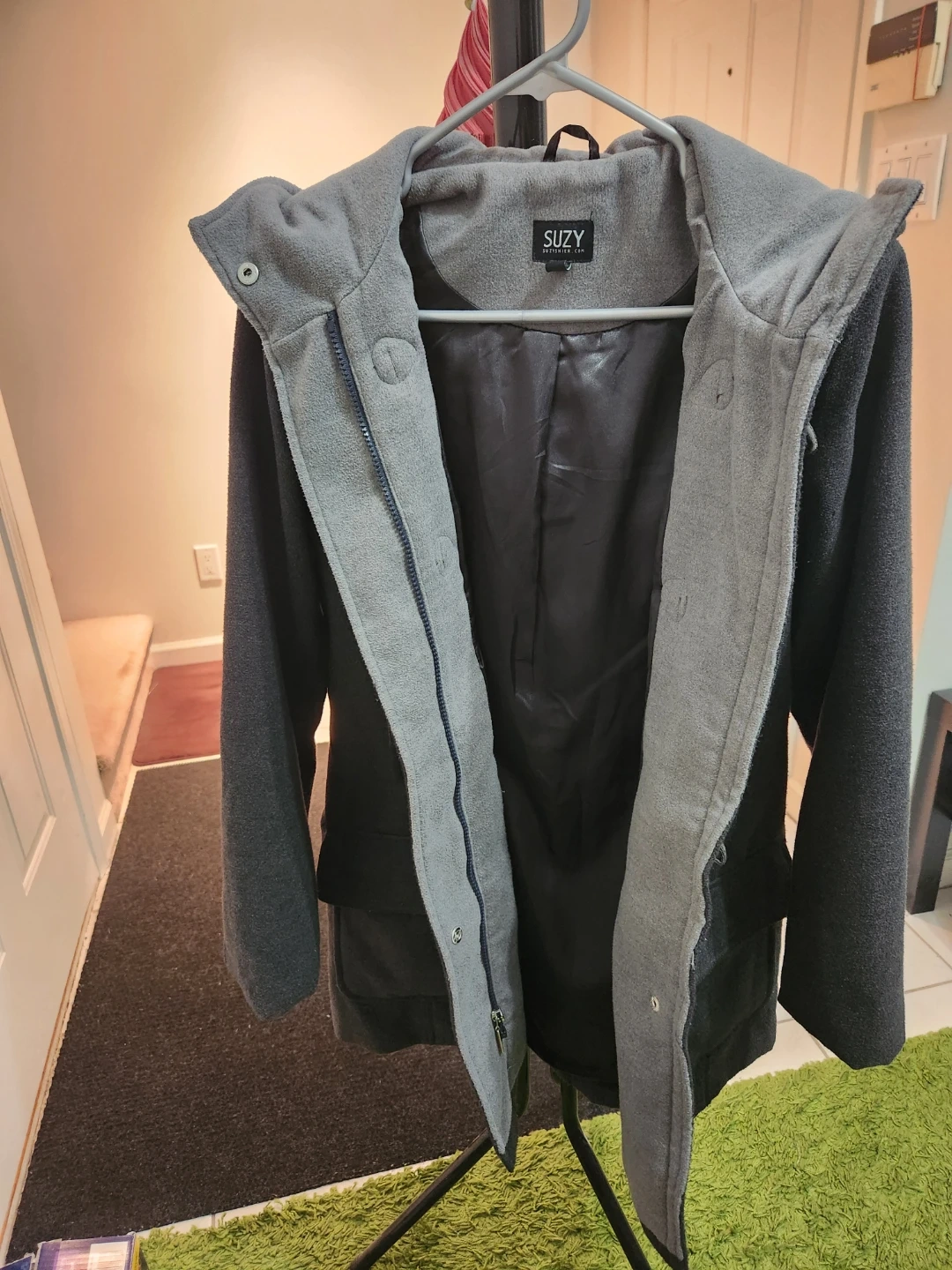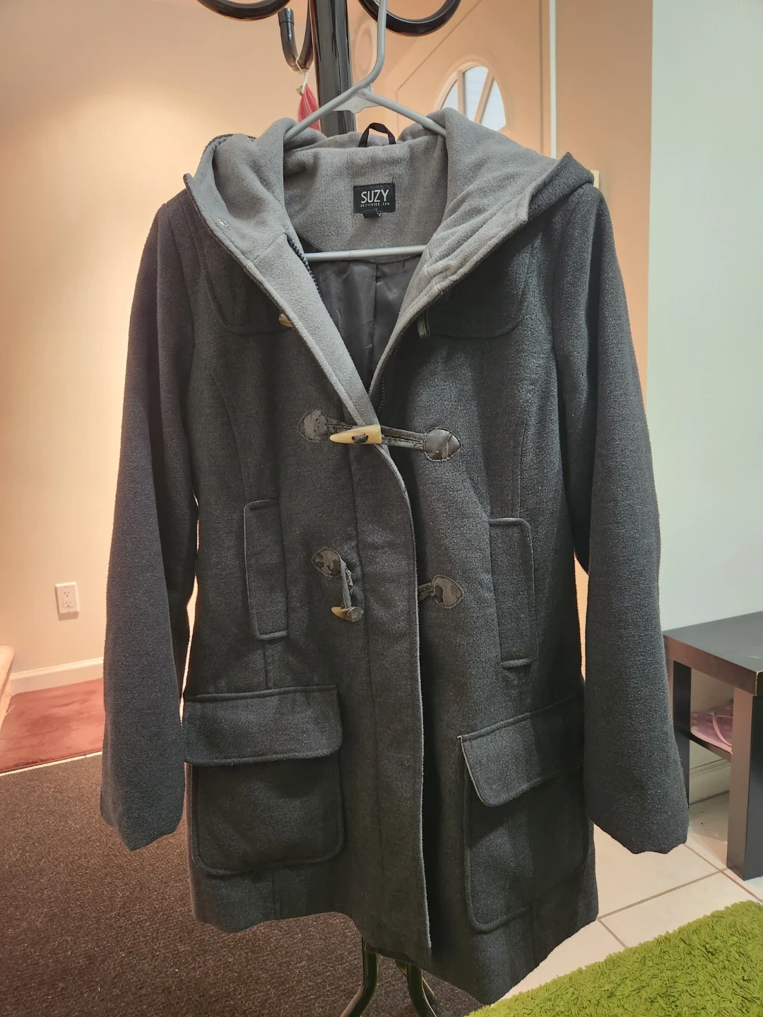 This Suzy women's hooded duffle coat is grey and size M/M. It's made from 88% polyester, 10% rayon, and 2% leather fiber with a polyester lining. Features toggles and a zipper closure. Please note that the leatherette from the toggle closures are peeling off but it is unnoticeable and still stylish. Perfect for Spring weather.