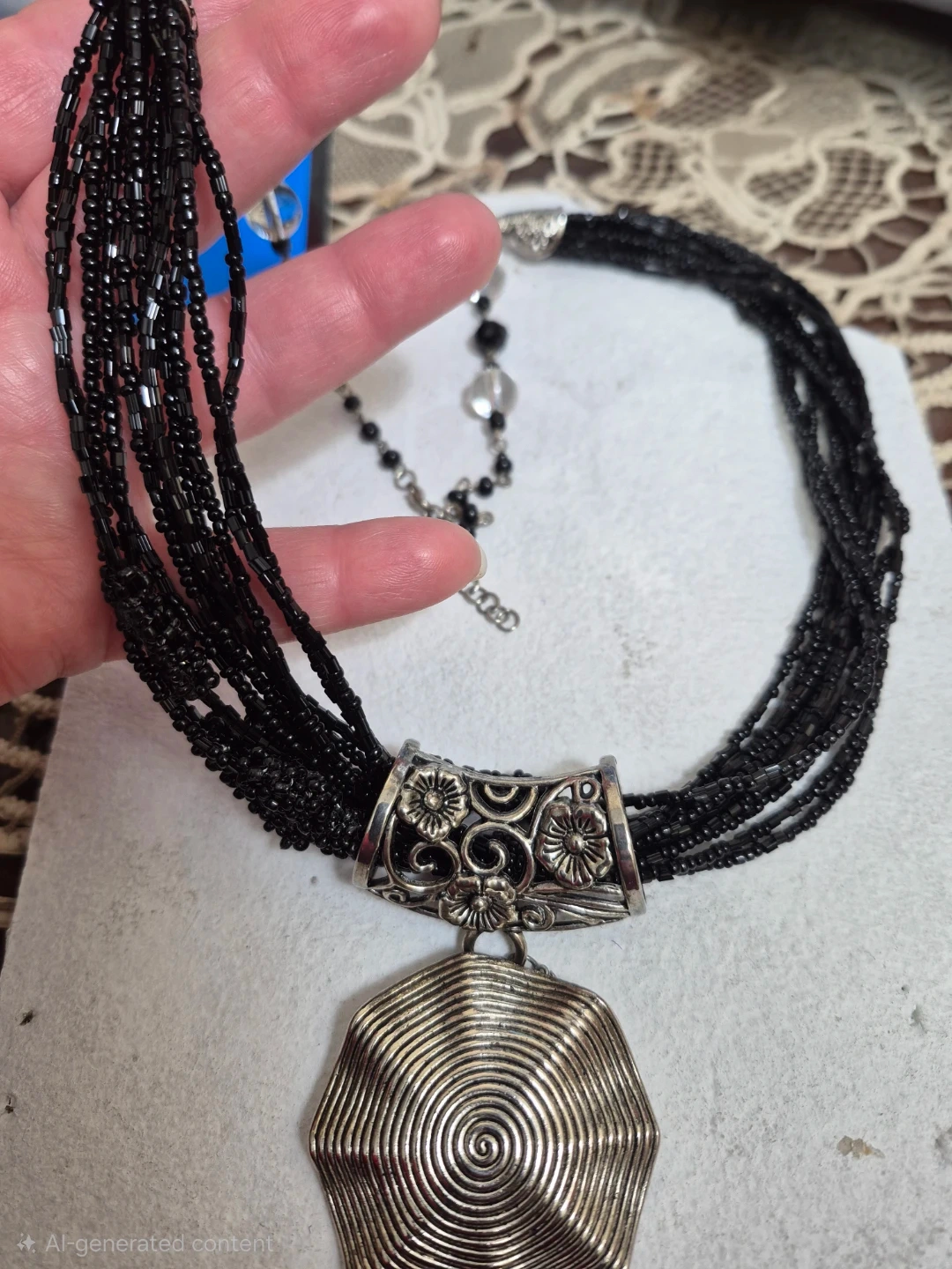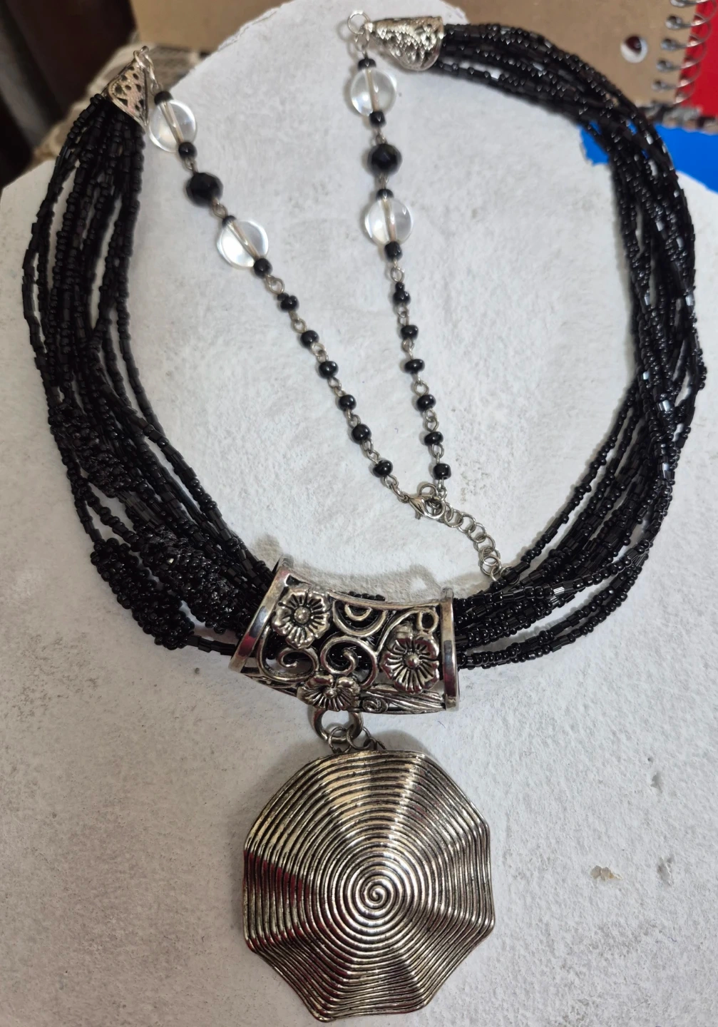Multi-strand black beaded necklace featuring a large, silver-tone pendant with a prominent spiral design. The pendant hangs from a decorative silver-tone piece with floral cutouts. It's secured with a lobster clasp and an extender chain for adjustable length. This necklace adds a bold statement to any outfit!