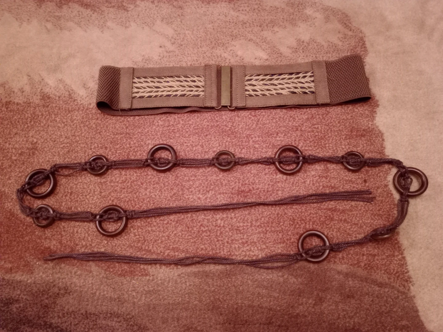 Accessorize with these stylish belts! This listing features a used brown woven stretch belt, perfect for cinching any outfit, and a used long brown belt with circle accents, offering a unique bohemian flair. Both belts are in good condition and ready to add some pizzazz to your wardrobe.