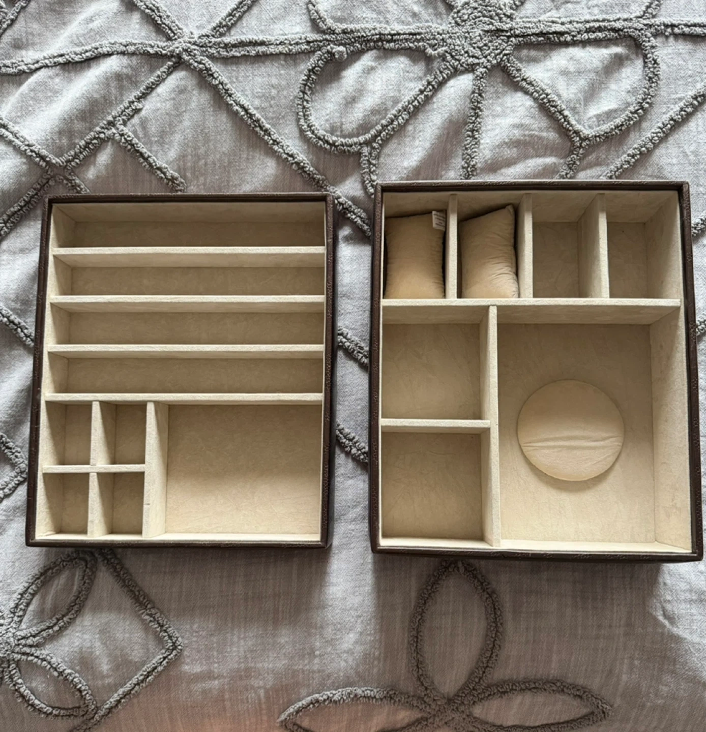This jewelry organizer box features multiple compartments for storing rings, necklaces, and other accessories. It's made with a dark brown faux leather exterior and a light beige interior lining. The trays are designed to keep your items neatly separated. It's great for keeping your dresser tidy! Pick up in Springbank Hill