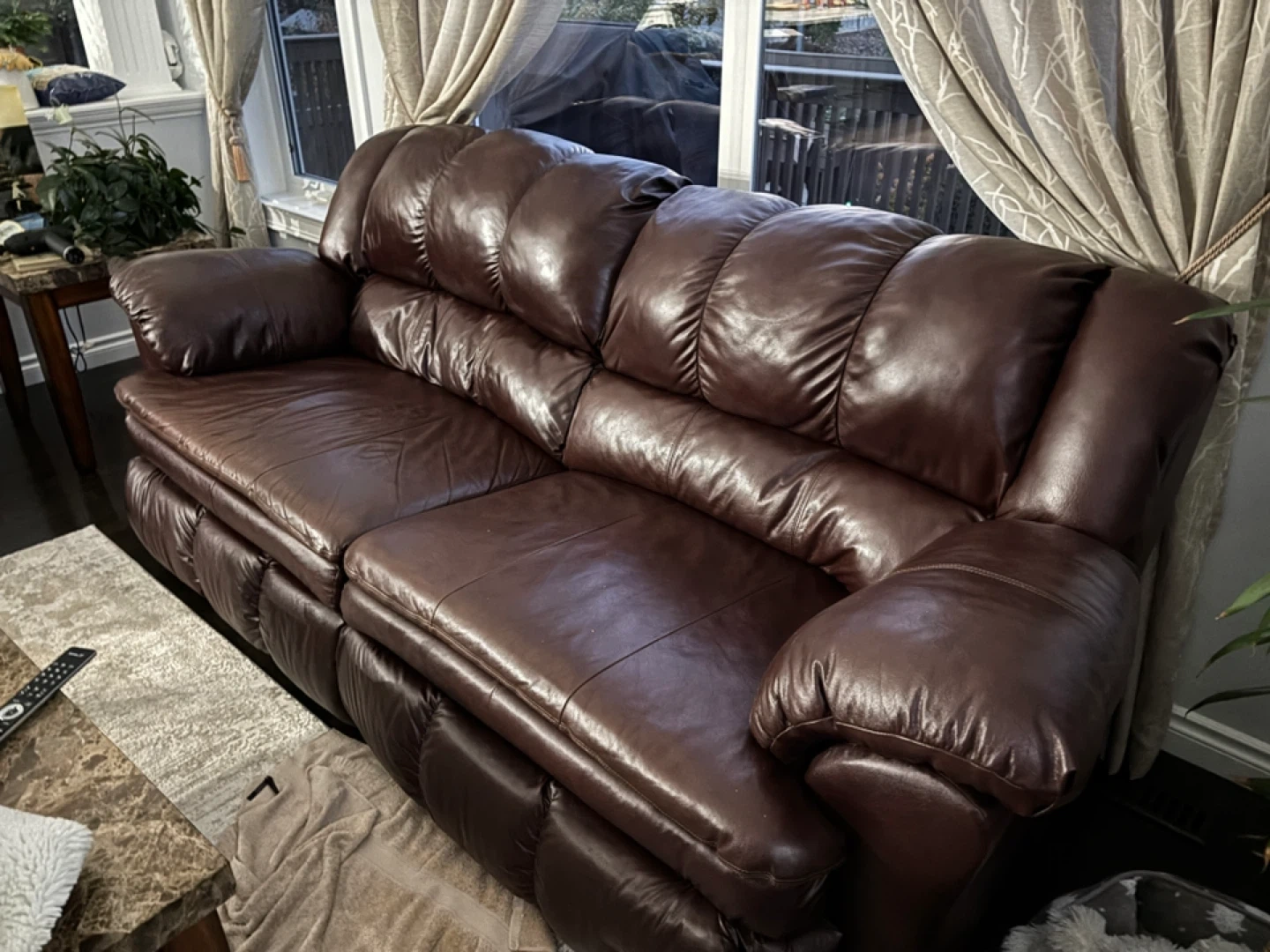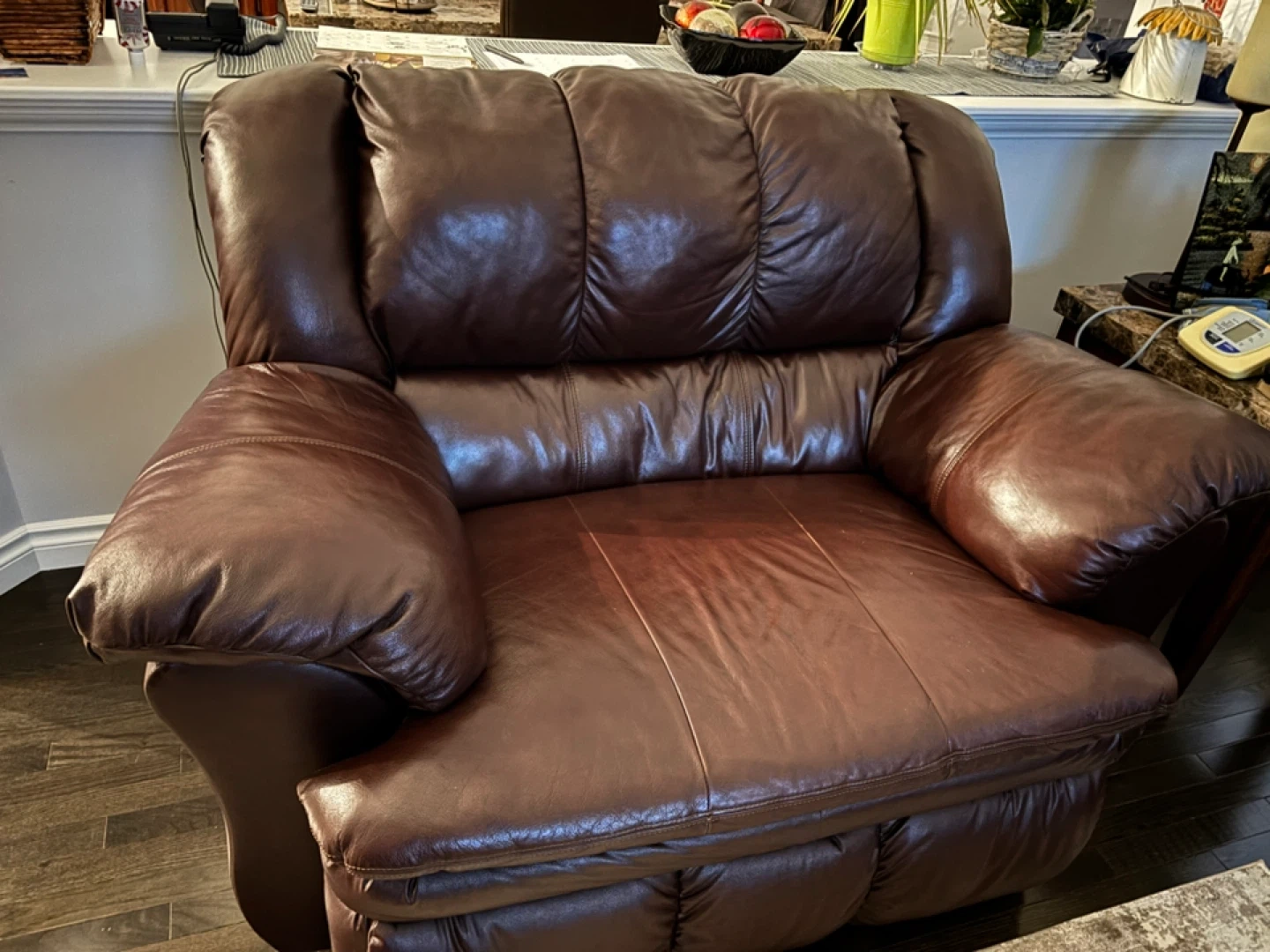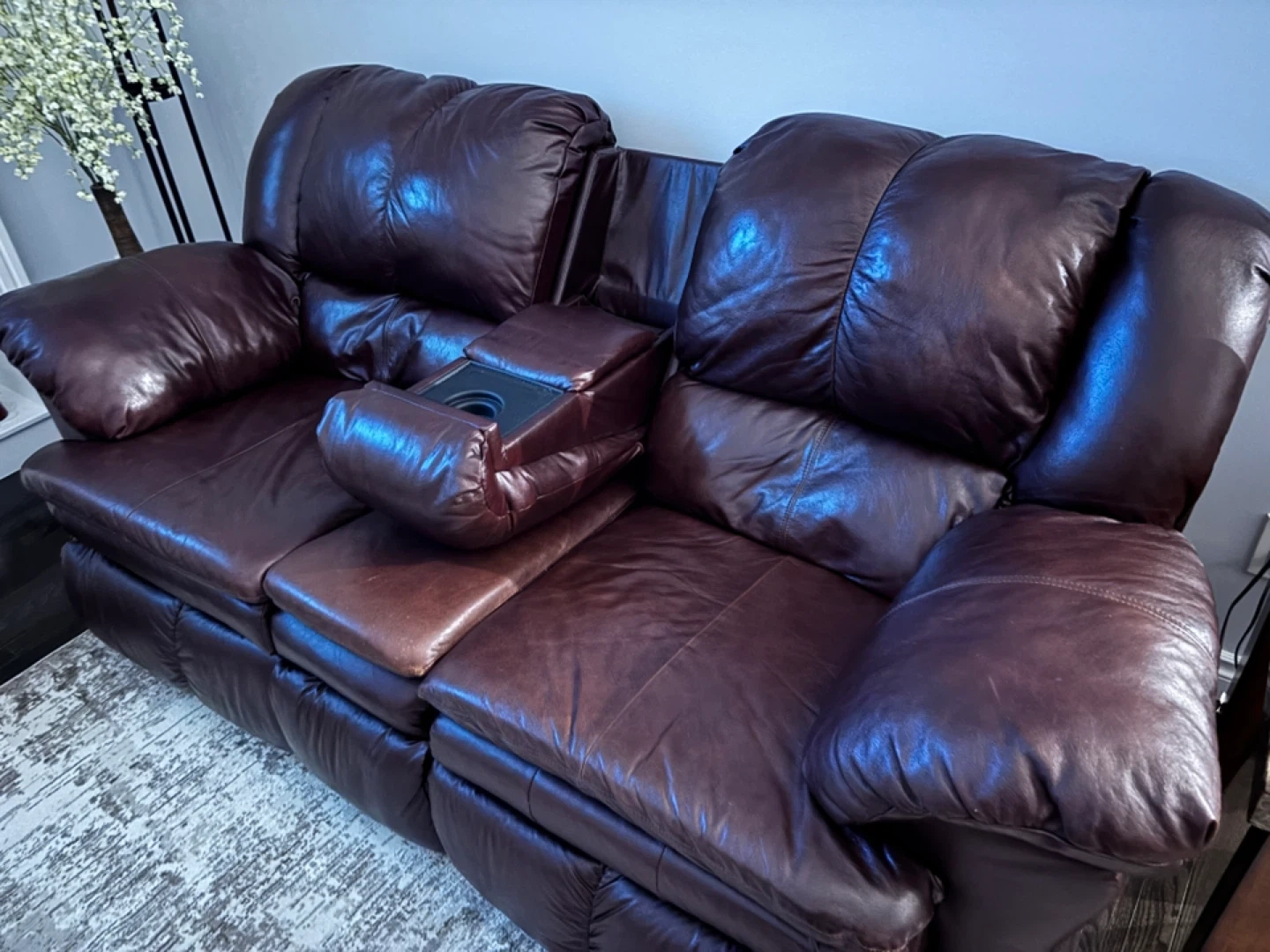 Selling a comfy brown leather reclining sofa and chair set. It's perfect for a living room or den. The sofa has a built-in console with cup holders. Both pieces are in good condition and ready for a new home!