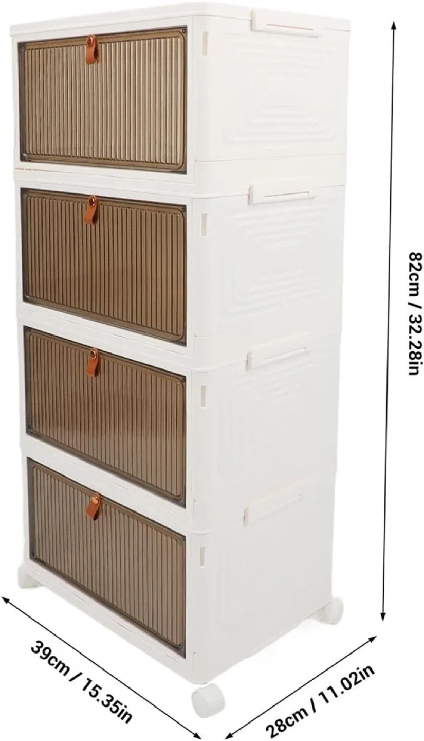 This stackable storage cabinet comes with four drawers and wheels for easy mobility. It's made of plastic with brown translucent drawer fronts. The overall dimensions are 82cm (H) x 39cm (W) x 28cm (D). It's useful for organizing various items around your home.