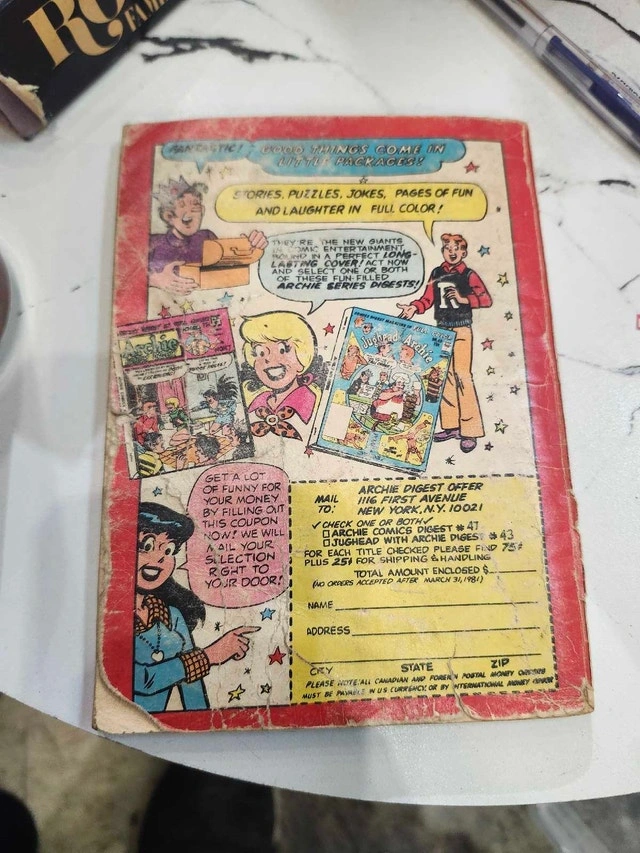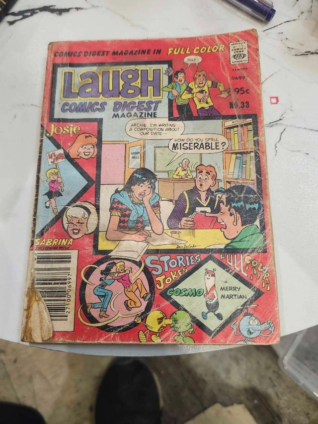 Laugh Comics Digest Magazine in full colour No. 33, featuring Archie and the gang. This digest has been read and loved, showing its age with wear and tear, but it's still full of classic comic charm. If you're feeling nostalgic or looking to add to your collection, this could be a fun find! If the ad's up, it's still waiting for a new home. Cash accepted.