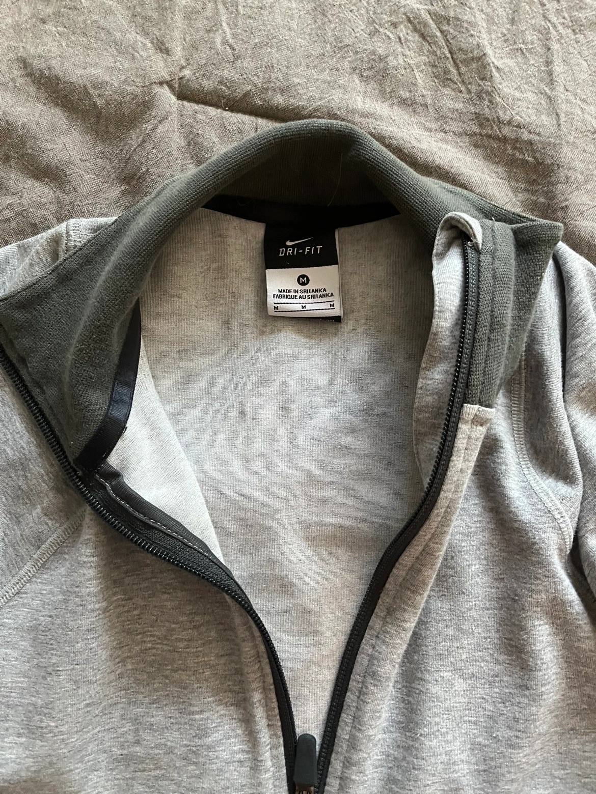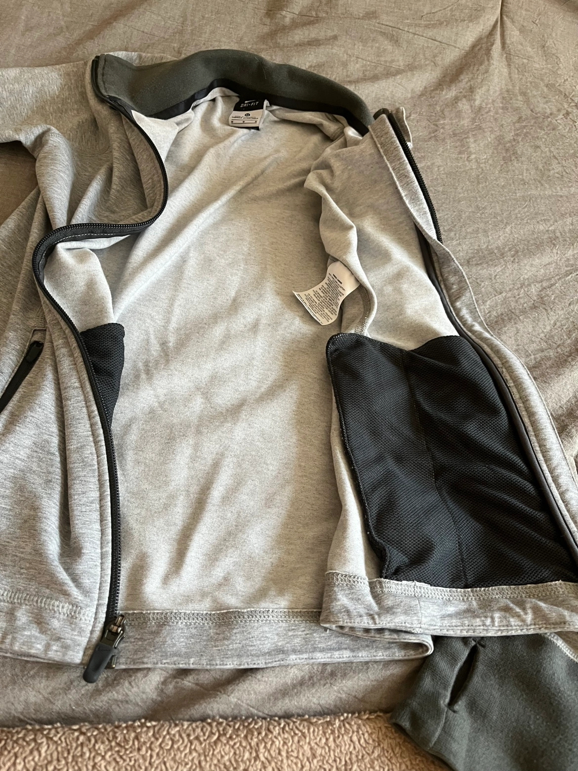 Thumb hole on sleeve cuffs, full zip pockets. Light grey color. Cotton/Poly/Spandex Blend