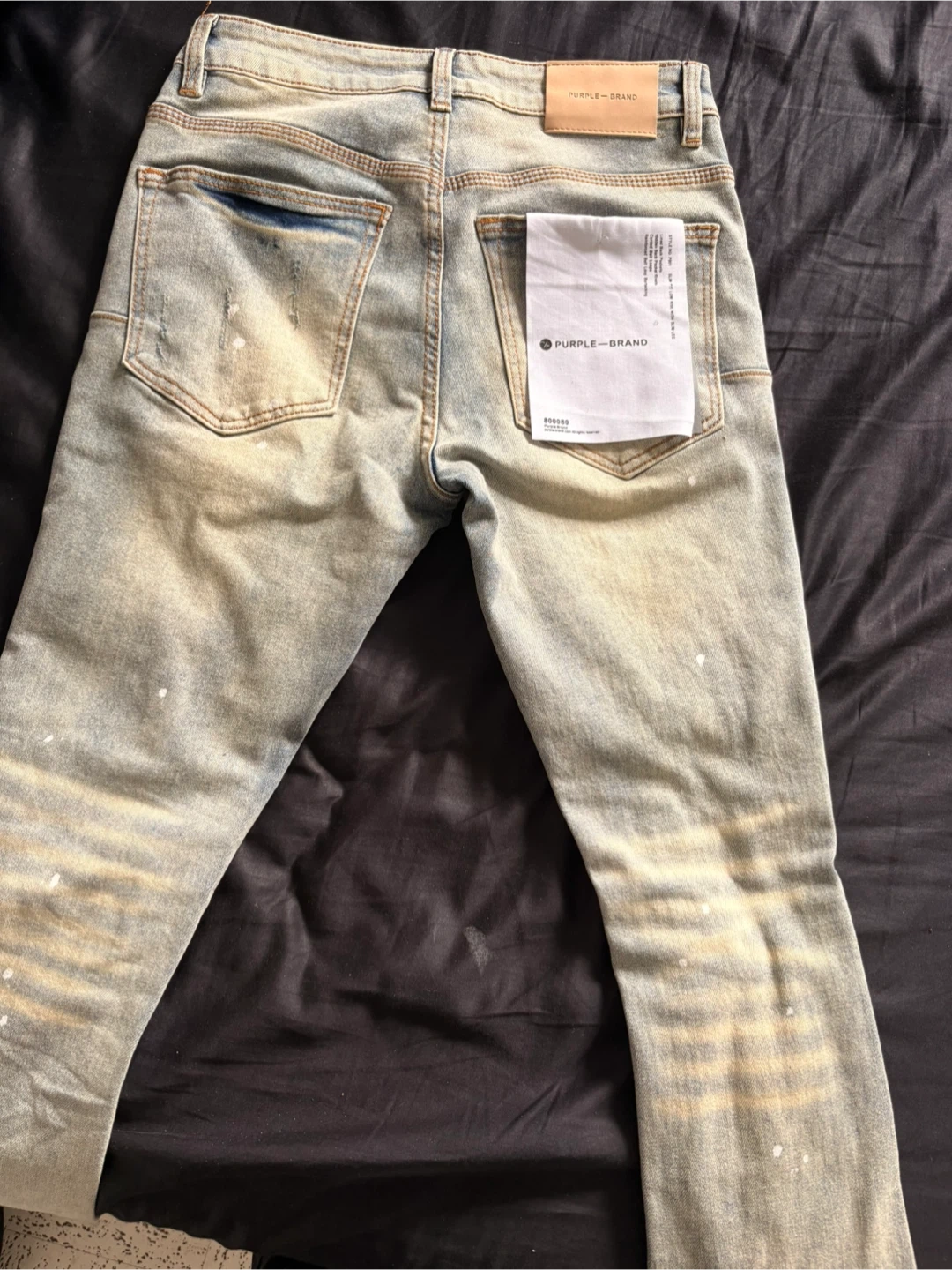 Purple Brand Denim Collection slim fit jeans in a light wash with distressing. Size is 28. Comes with original packaging.