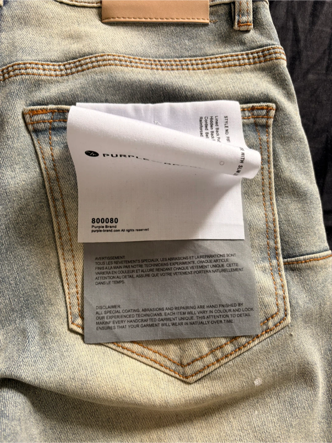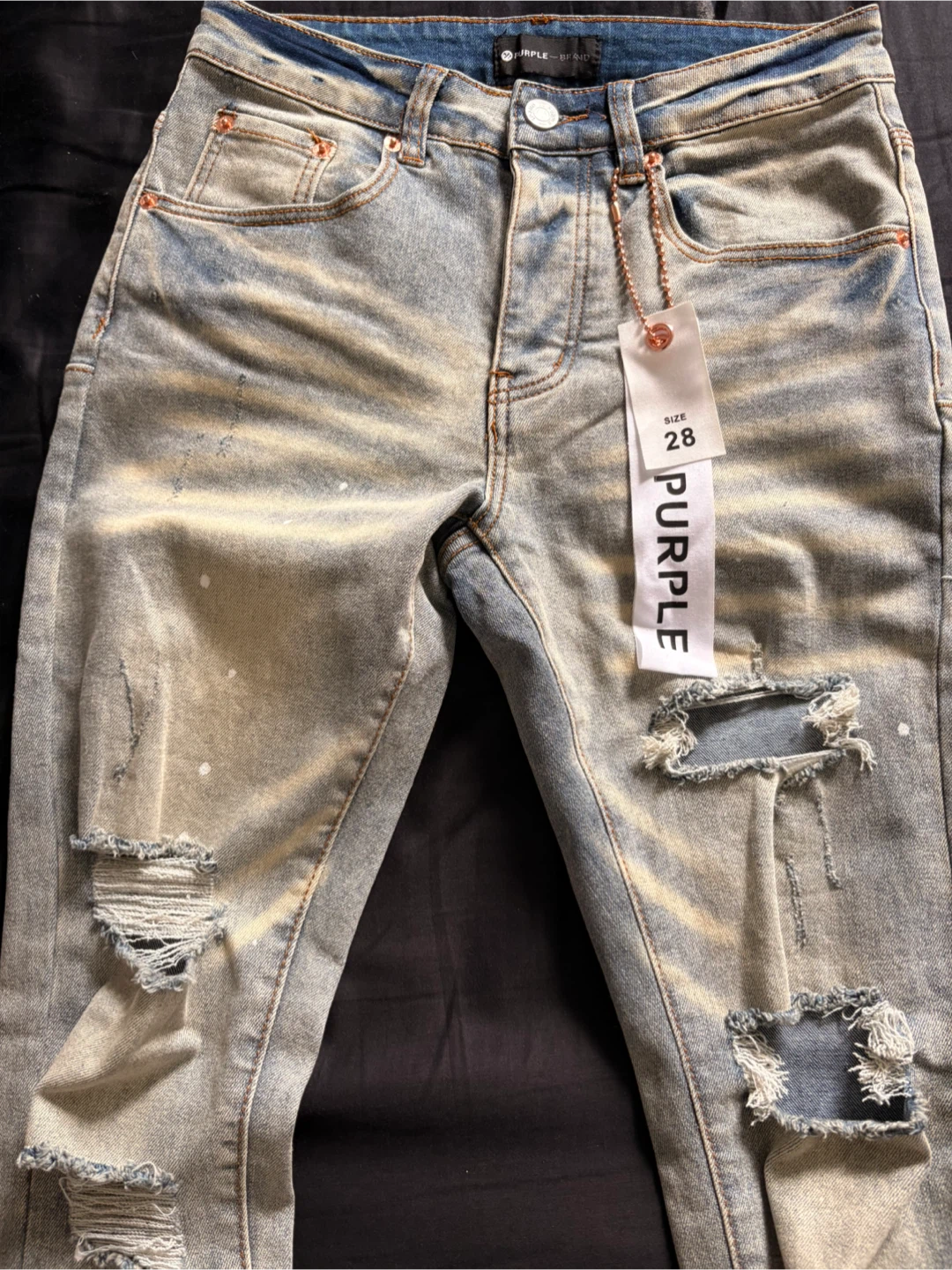 Purple Brand Denim Collection slim fit jeans in a light wash with distressing. Size is 28. Comes with original packaging.