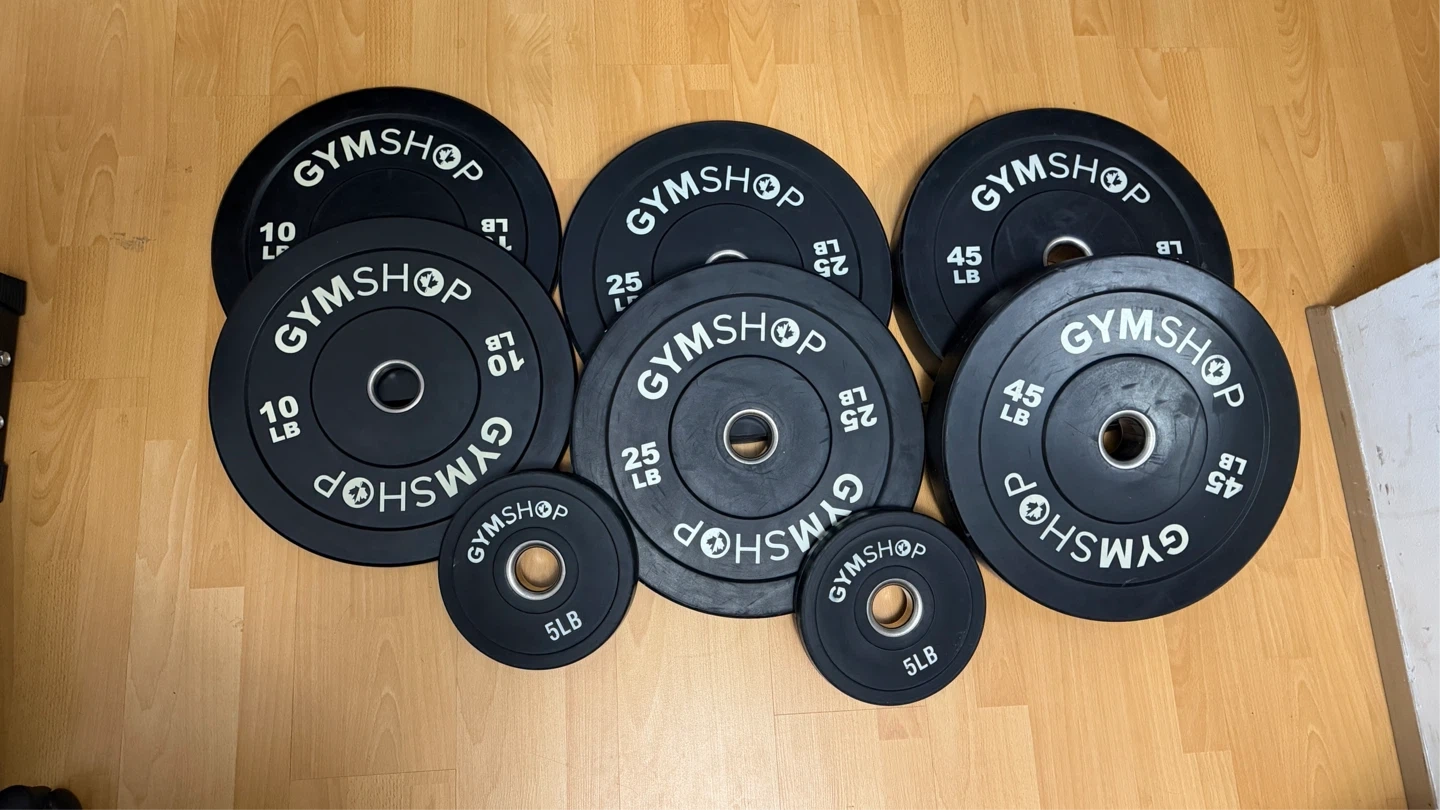 Set of Gymshop weight plates. Includes 10lb, 25lb, 45lb, and 5lb weights. These are durable bumper plates for any home gym setup.