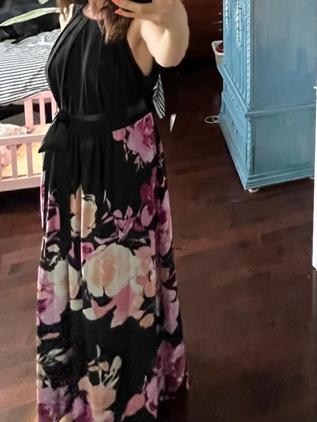 Size 16, worn once, purchased from Laura Plus boutique. Beautiful fancy black chiffon-like top with floral bottom and a lovely sash. Beautiful for summer, very roomy and comfortable. Can be worn formally or semi-formally.