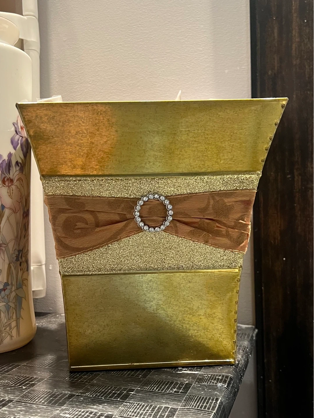 This decorative gold container features a textured bronze band with a swirling pattern and a gold glitter accent. A satin ribbon with a jeweled centrepiece adorns the front. It's a stylish piece for any home decor. Perfect for holding small items or as a standalone accent!