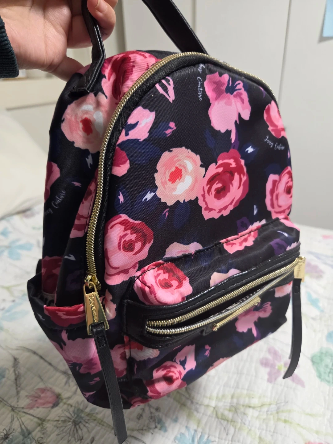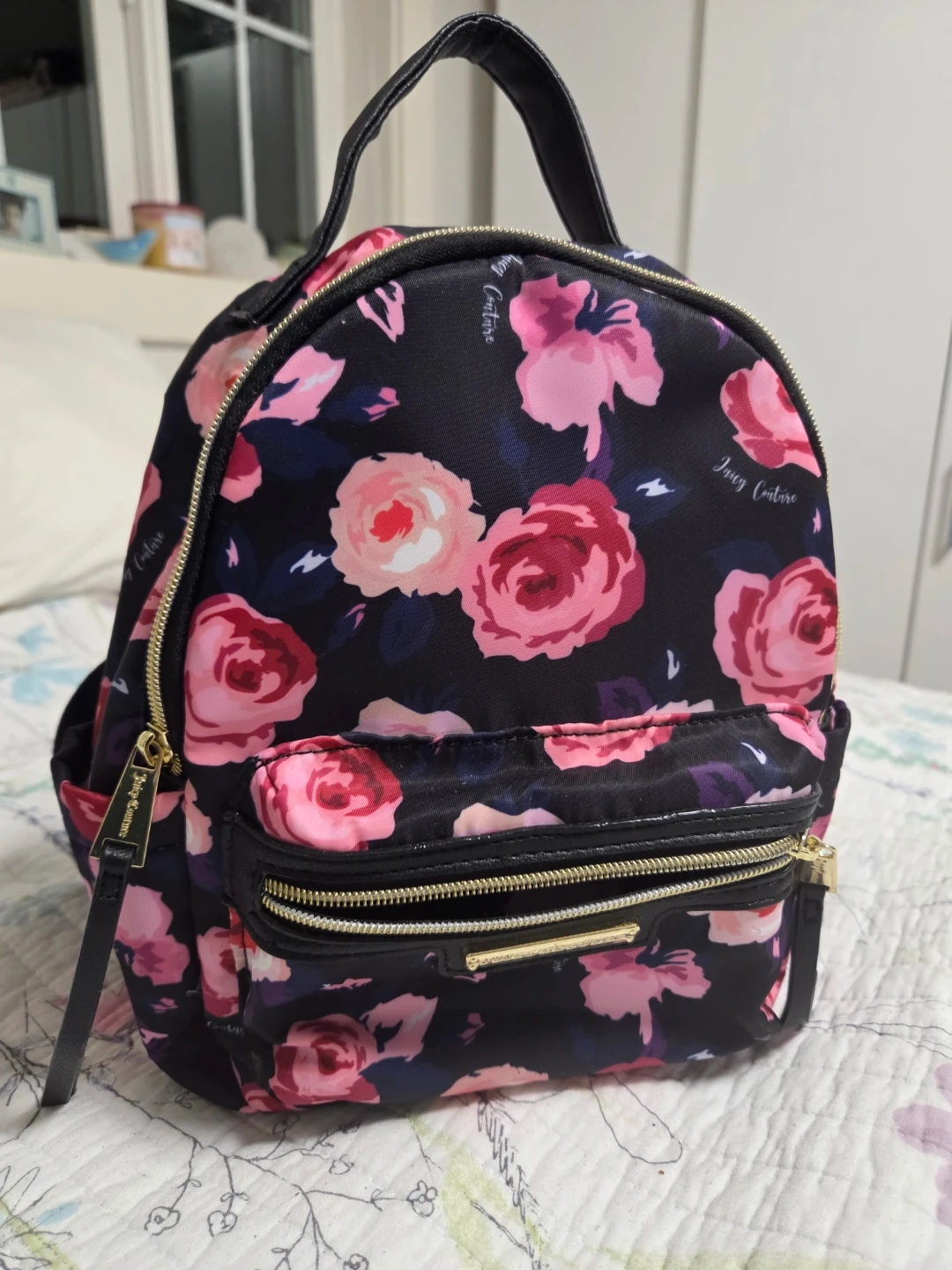 brand new Juicy Couture backpack with a black floral print. It features gold hardware and multiple zippered compartments. A stylish and practical accessory for everyday use!
