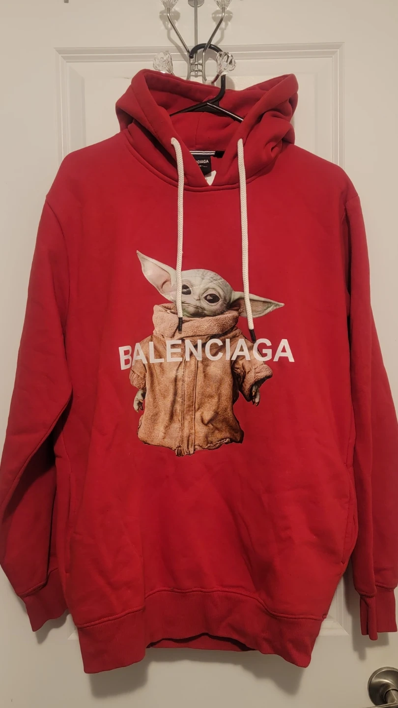 This is a red Balenciaga hoodie featuring a graphic of Baby Yoda. Has pockets on sides. A unique piece for fans of Star Wars and designer streetwear!