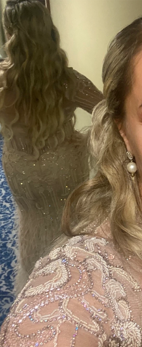Exquisite Terani Couture gown with a high neck and long sleeves. Features intricate beading and delicate feather accents throughout. Made from tulle fabric in a blush hue. Perfect for formal events!