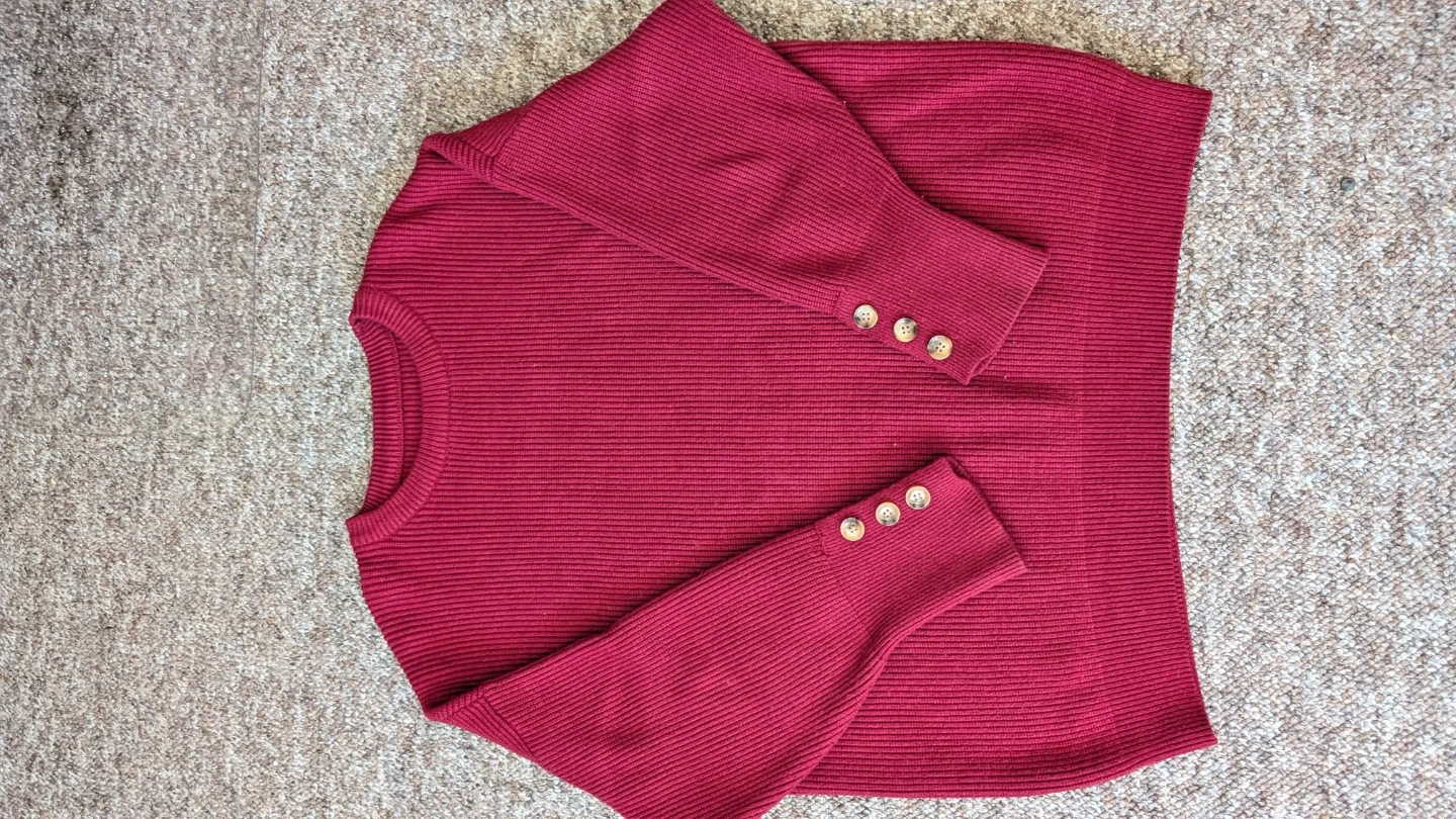 Cozy ribbed knit sweater in a rich maroon colour. Features decorative button details on the cuffs. It's made from a soft, comfortable fabric. This sweater is great for layering during cooler weather.