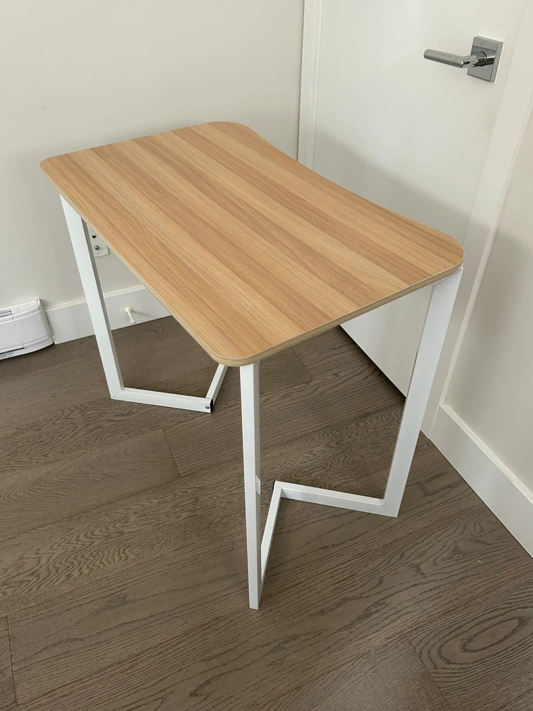 A compact desk featuring a light wood-look laminate top with rounded edges. It's supported by a sturdy white metal frame. This desk is great for smaller spaces!