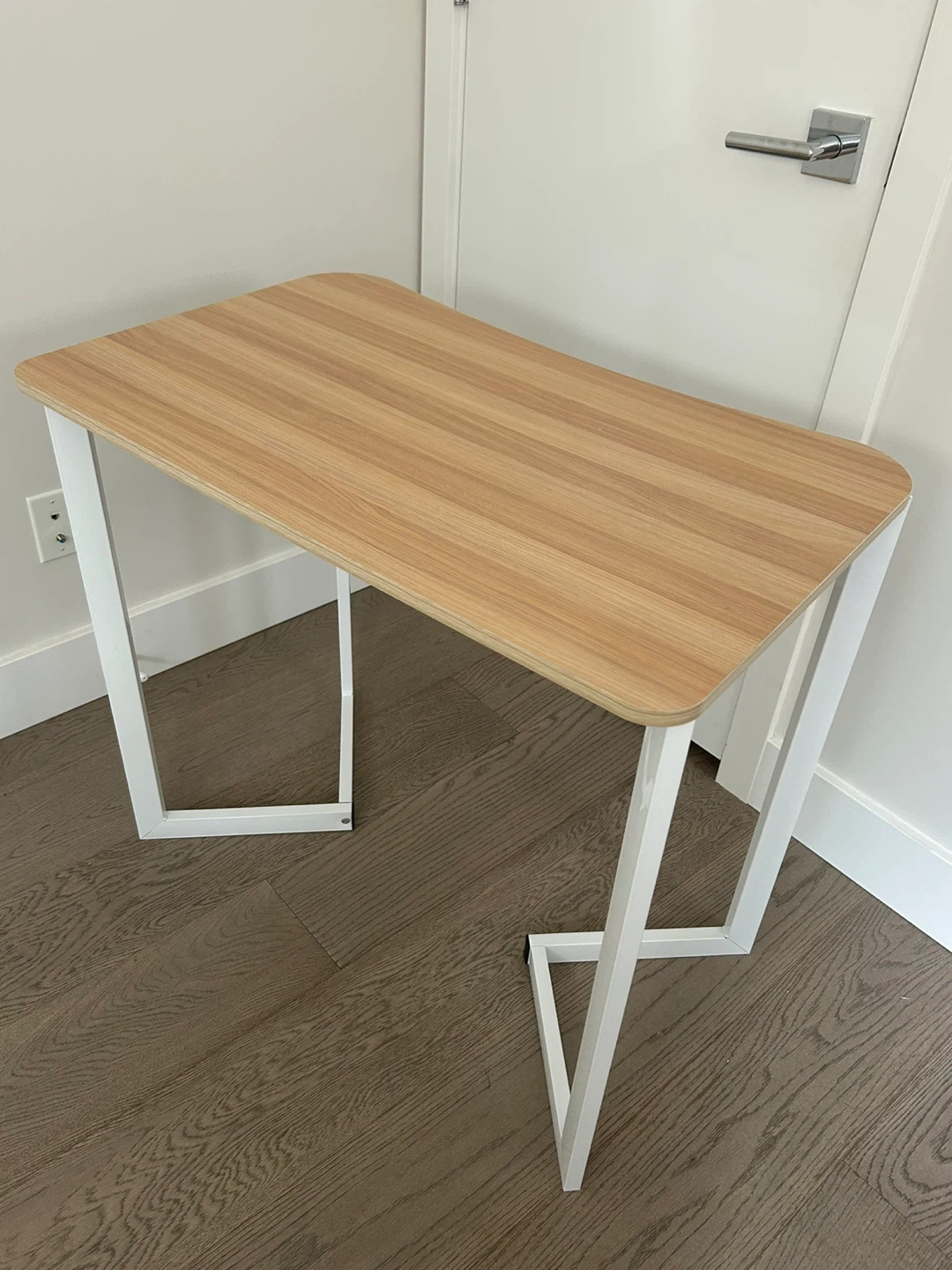 A compact desk featuring a light wood-look laminate top with rounded edges. It's supported by a sturdy white metal frame. This desk is great for smaller spaces!