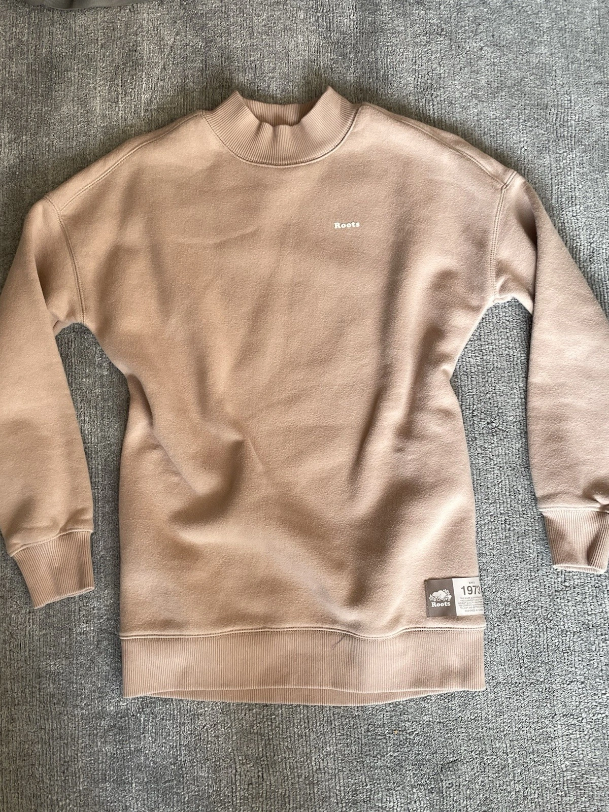 Women's Roots activewear set- top: size 2XS, bottom: XS. Includes a sweatshirt and sweatpants in tan. Feel free to message if you have any questions!