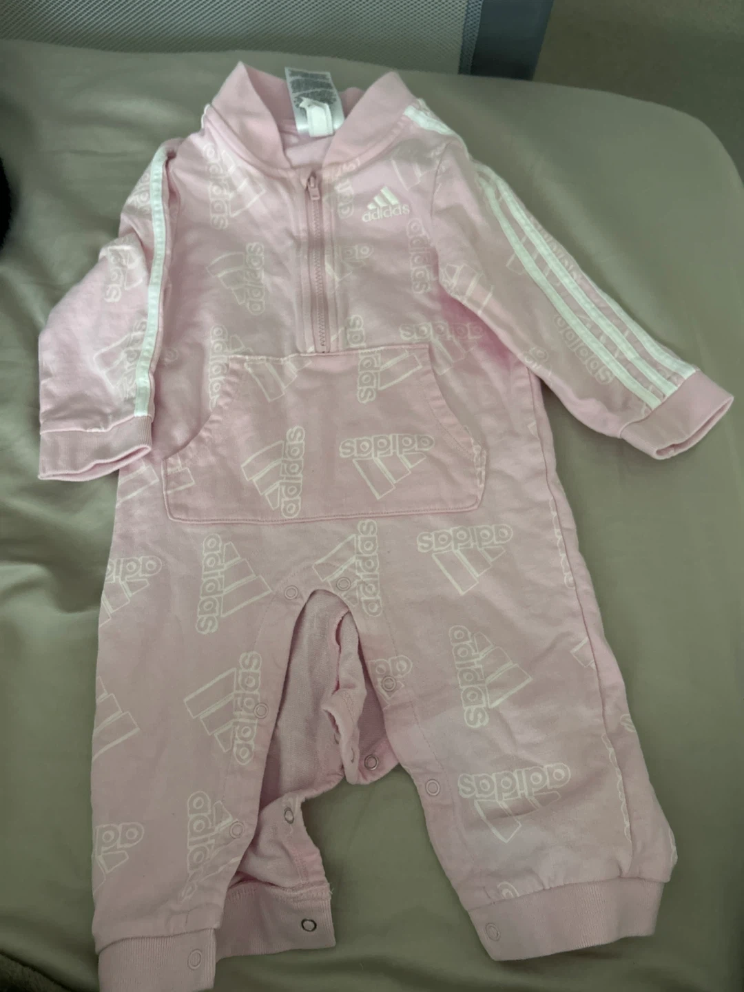 Adorable pink hooded romper for baby girls, featuring an all-over white Adidas logo print. It's a cozy, one-piece outfit with a half-zip closure and a front pocket. This is a sweet and practical item for your little one!