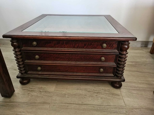 Elevate your living space with this elegant wood coffee table, featuring a glass top and three functional drawers for discreet storage, offered in used condition. This coffee table is a statement piece, blending functionality with classic design. The glass top adds a touch of modern elegance, while the three drawers provide convenient storage for your living room essentials. This item is in used condition, showing some signs of wear that add to its character. Perfect for adding a touch of sophistication to any living room. * Glass Top * 2 Drawers * solid Wood finish large heavy 40"x40"x20" If the ad is still up, it's still available! pu near chinook station