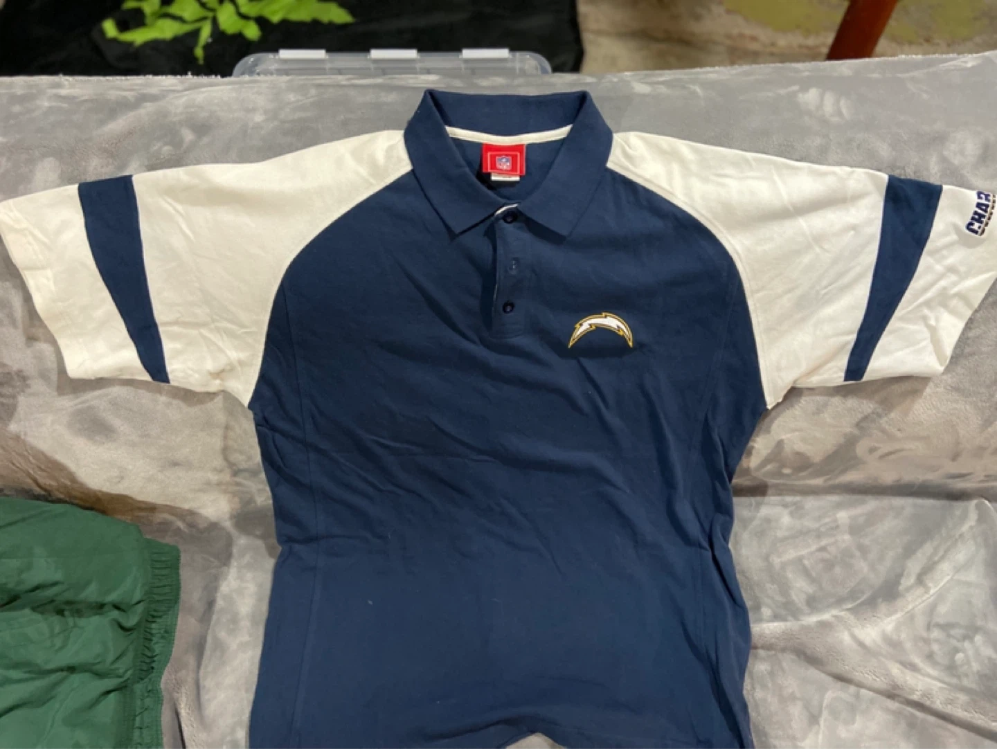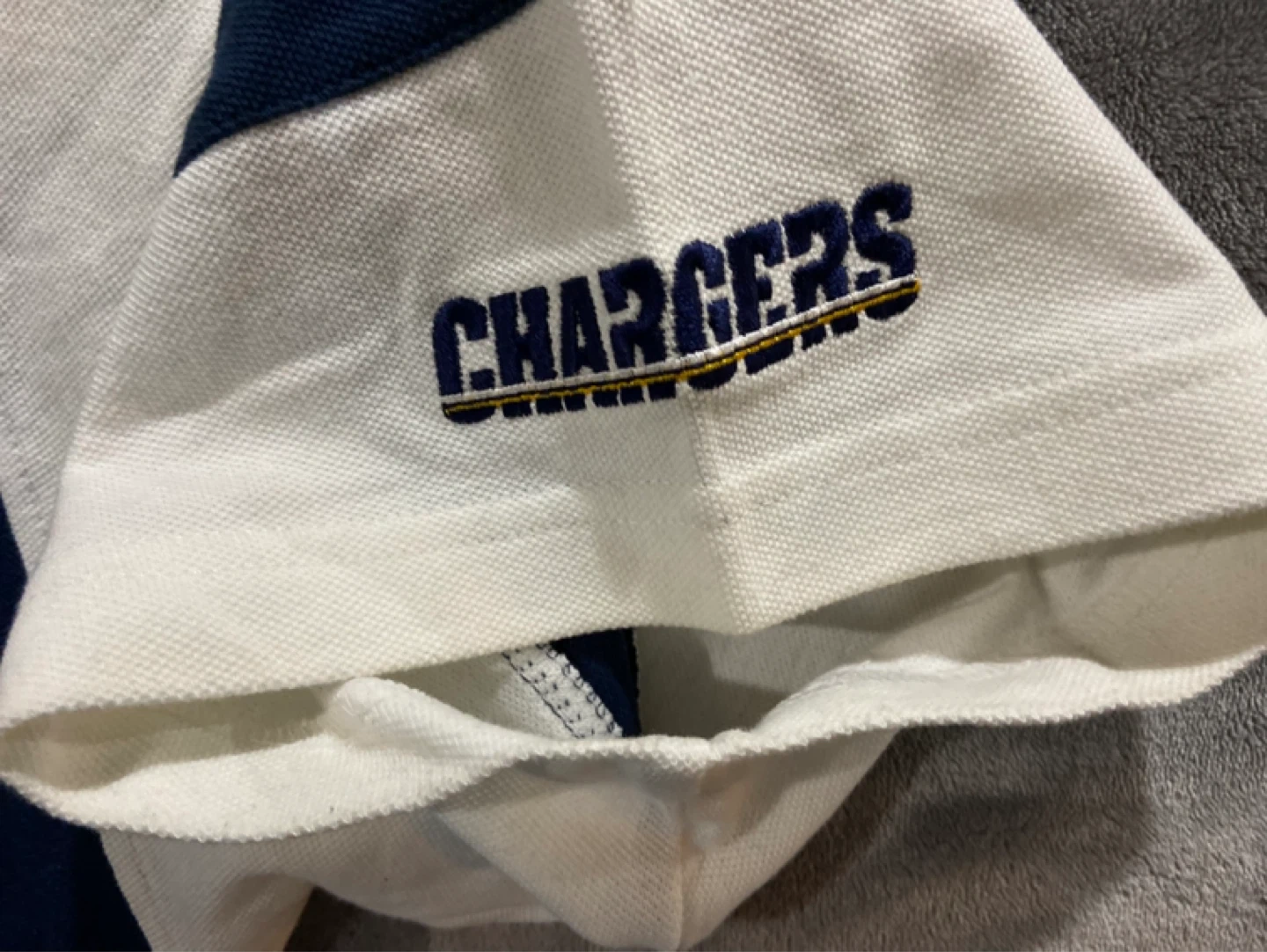 This is an NFL Los Angeles Chargers polo shirt. It's a size XL with the team name embroidered on the sleeve. The shirt is navy blue with white sleeves. Asking 15 new with no tags